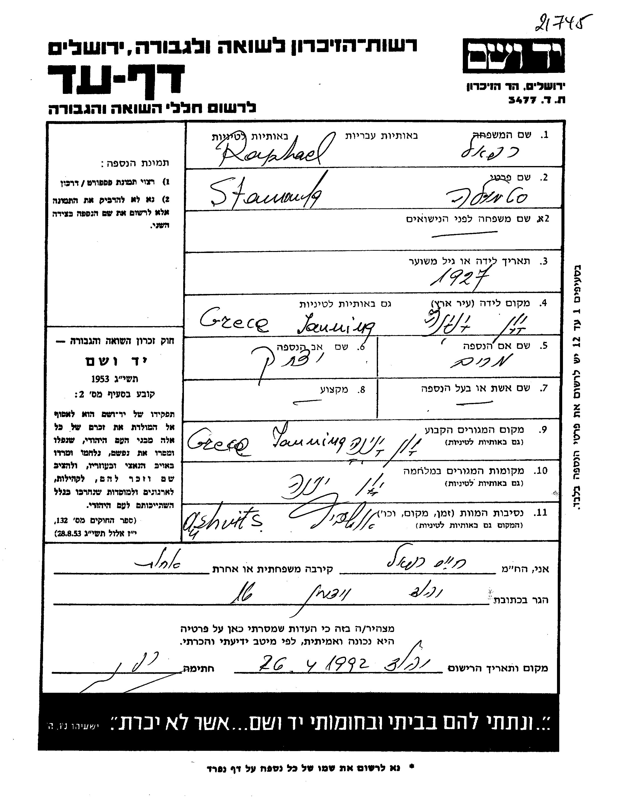 Stamoula wurde in der Schoah ermordet. Todesort: Auschwitz, Polen.