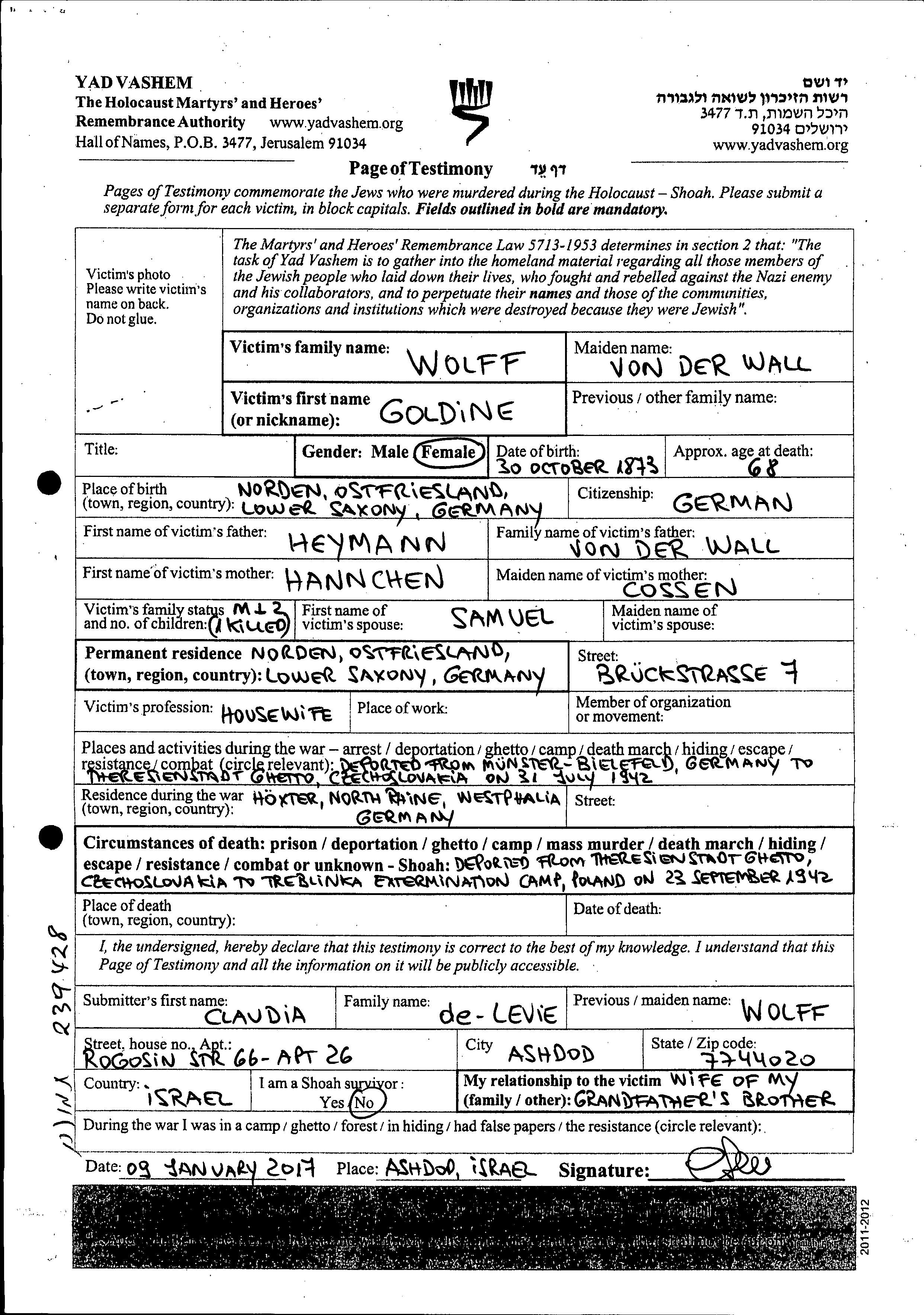 Goldine Wolff, geb. von der Wall wurde im Jahr 1873 in Norden, Deutsches Reich geboren. Sie war Hausfrau. Vor dem Zweiten Weltkrieg lebte sie in Norden, Deutsches Reich.