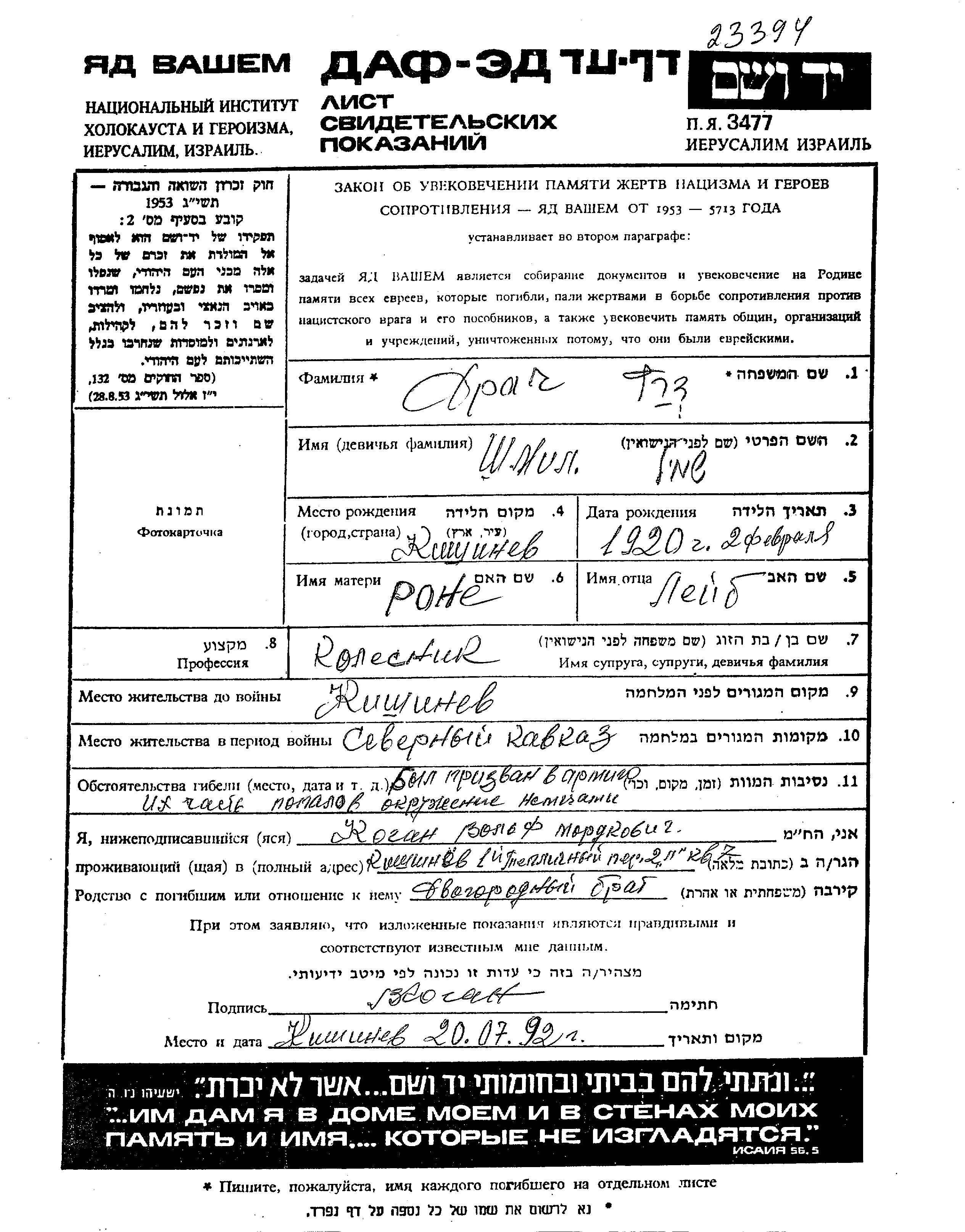 Shmil Drach wurde im Jahr 1920 in Kishinev, Rumänien geboren. Er war der Sohn von Leib und Rone. Er war Handwerker und Verheiratet. Vor dem Zweiten Weltkrieg lebte er in Kishinev, Rumänien. Während des Krieges war er in Caucasus Region, Russland (UdSSR).