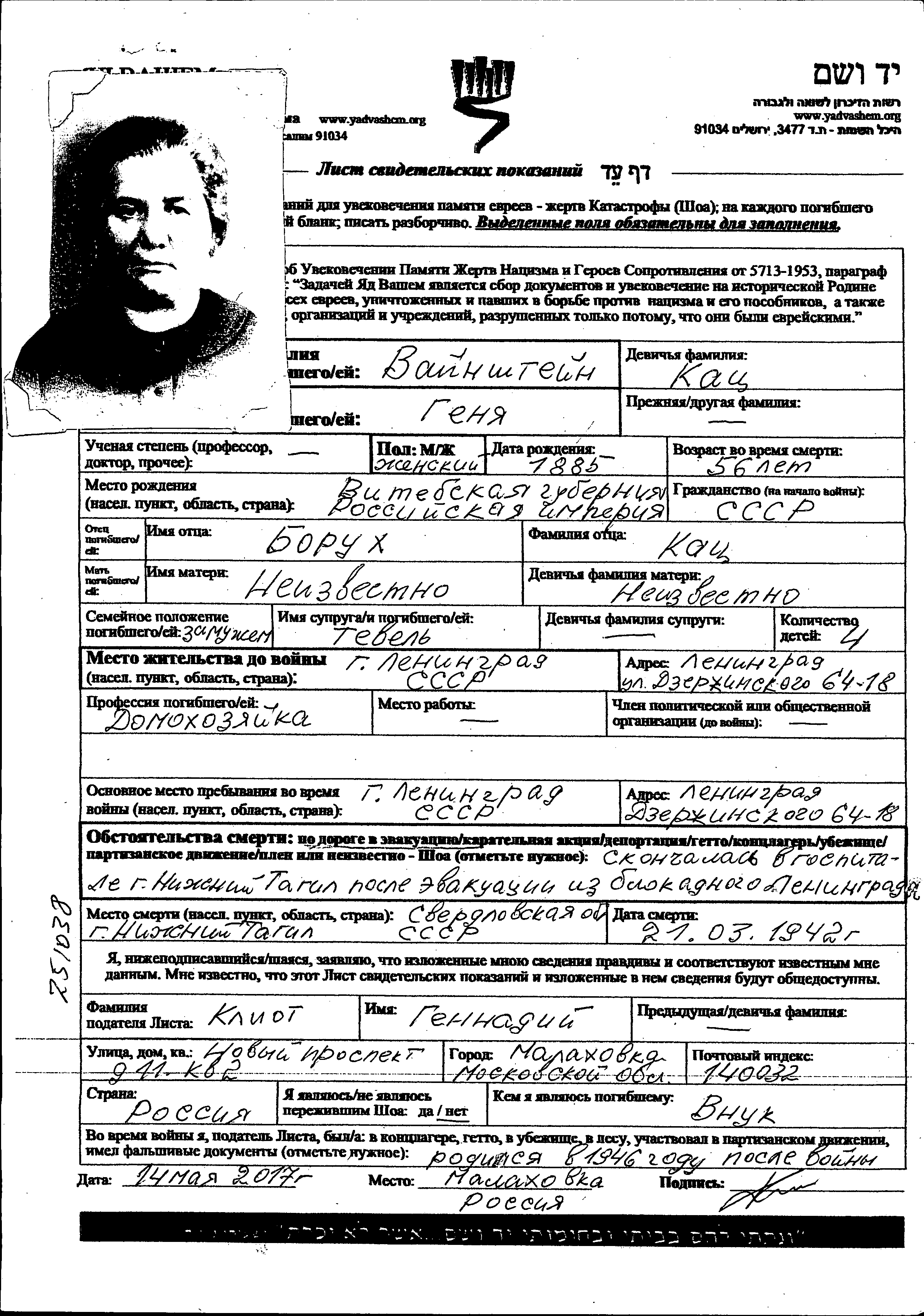 Genya Vaynshteyn, geb. Katz wurde im Jahr 1885 in Vitebsk, Weißrussland (UdSSR) geboren. Sie war Hausfrau. Vor dem Zweiten Weltkrieg lebte sie in Leningrad, Russland (UdSSR). Genya wurde in der Zeit zwischen 1933-1945 in indirekter Beziehung mit der Shoah umgekommen. Todesort: Nizhniy Tagil, Russland (UdSSR) im Jahr 21/03/1942.
