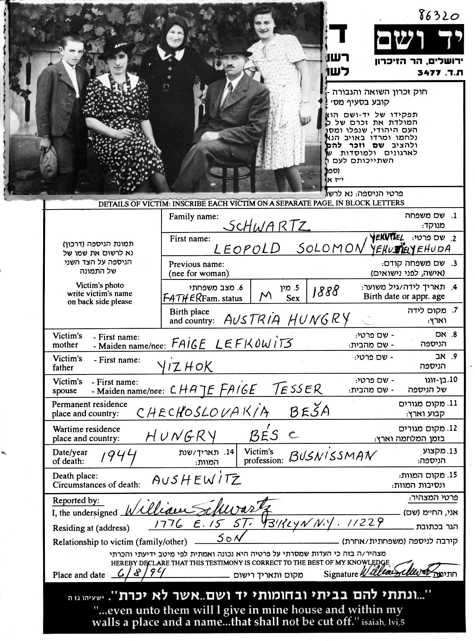 Solomon Leopold Schwartz wurde im Jahr 1888 in Tschechoslowakei geboren. Er war Geschäftsmann. Vor dem Zweiten Weltkrieg lebte er in Besa, Tschechoslowakei.
