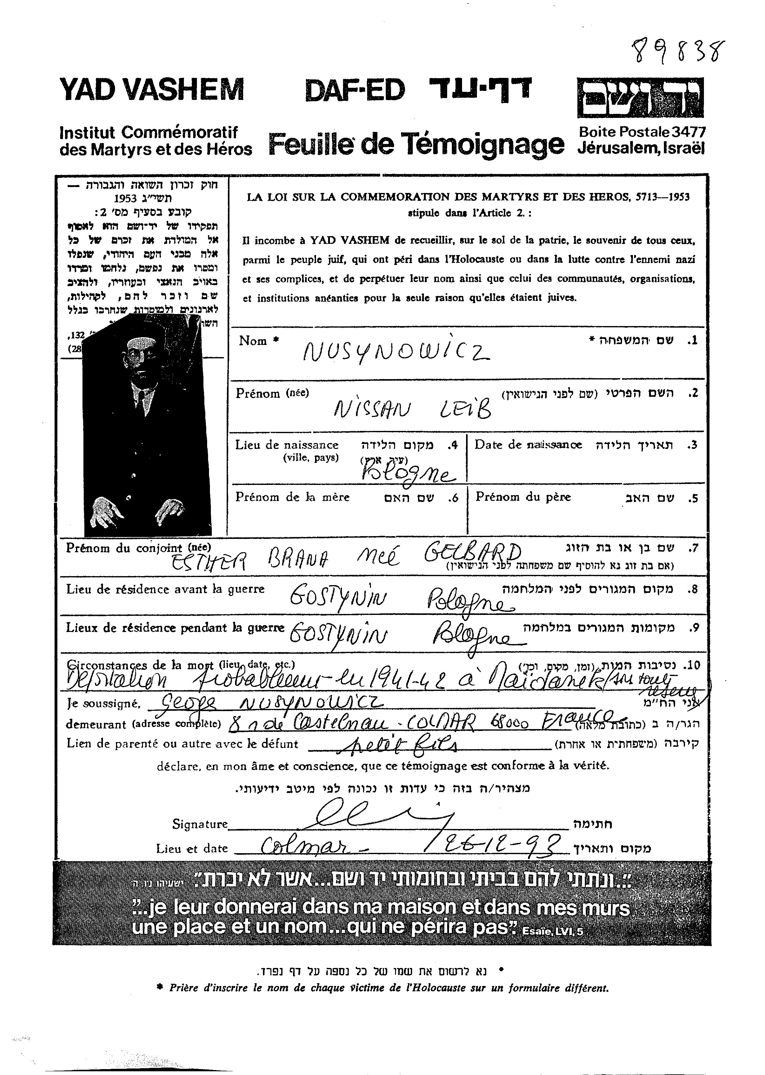 Nissan Leib wurde in der Schoah ermordet. Todesort: Majdanek, Polen.