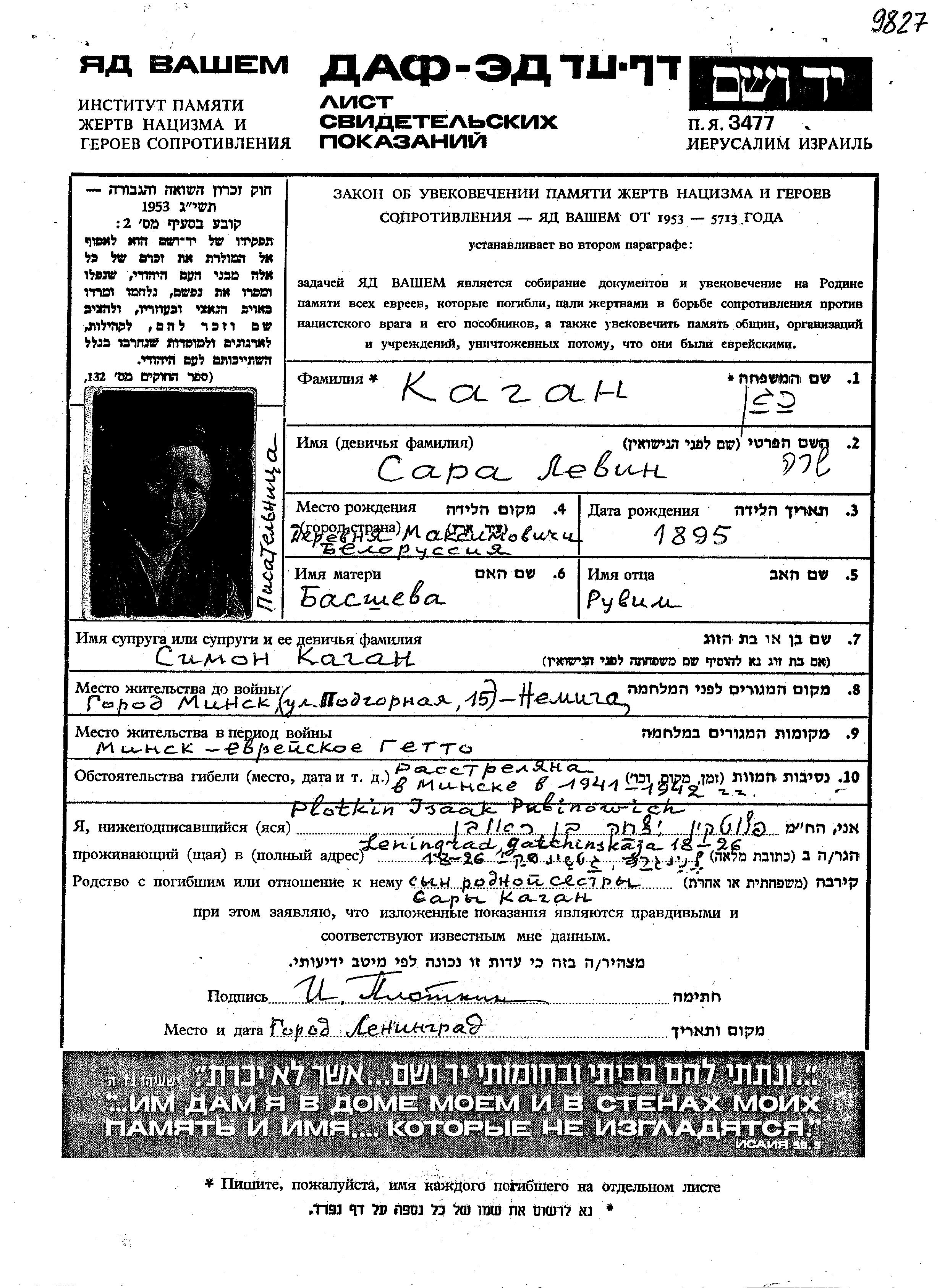 Kagan | Sara | 1895 | Minsk, Weißrussland (UdSSR) | Gedenkblatt |