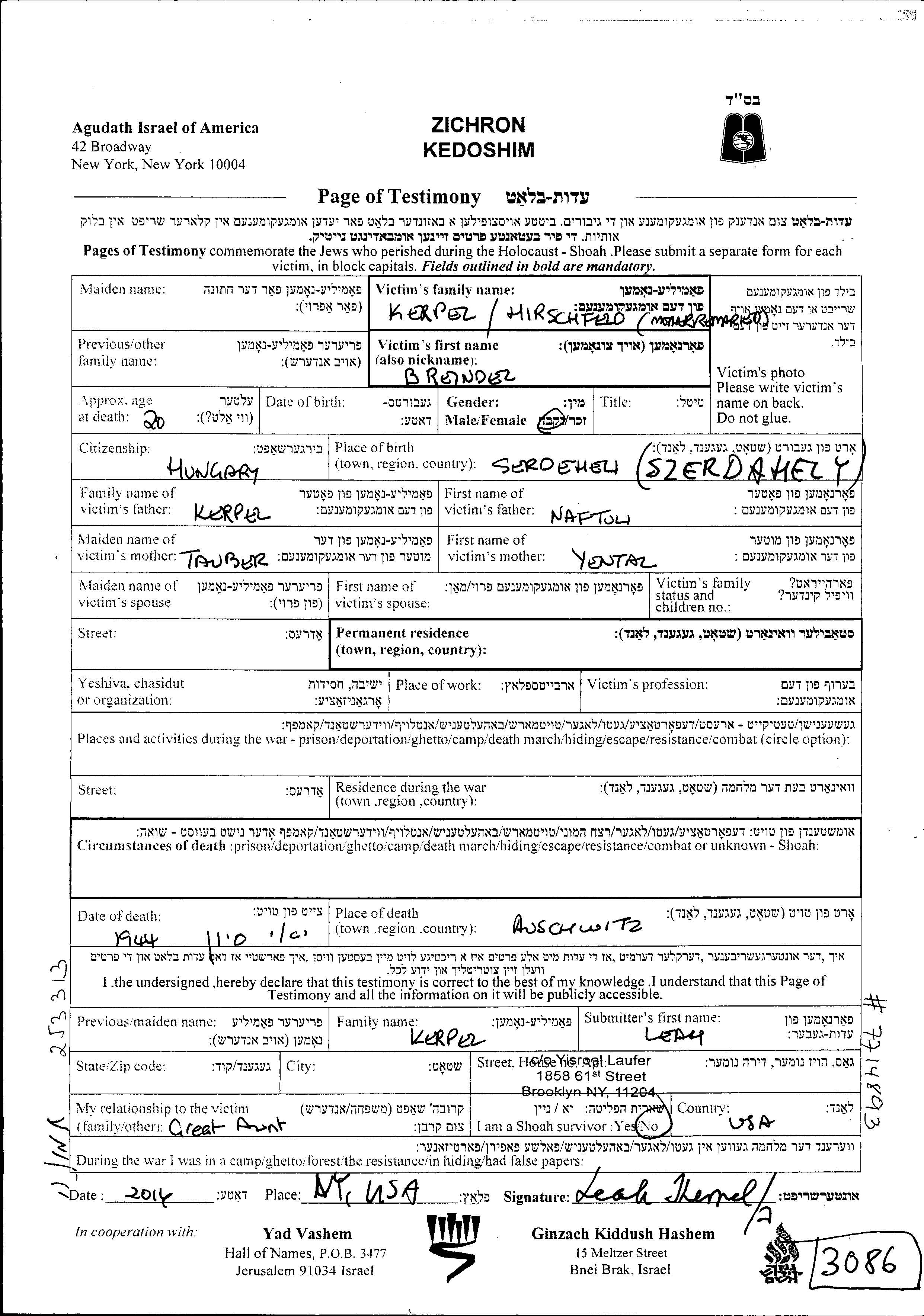 Kerpel Hirschfeld | Breindel | unbekannter Ort, | Gedenkblatt | |