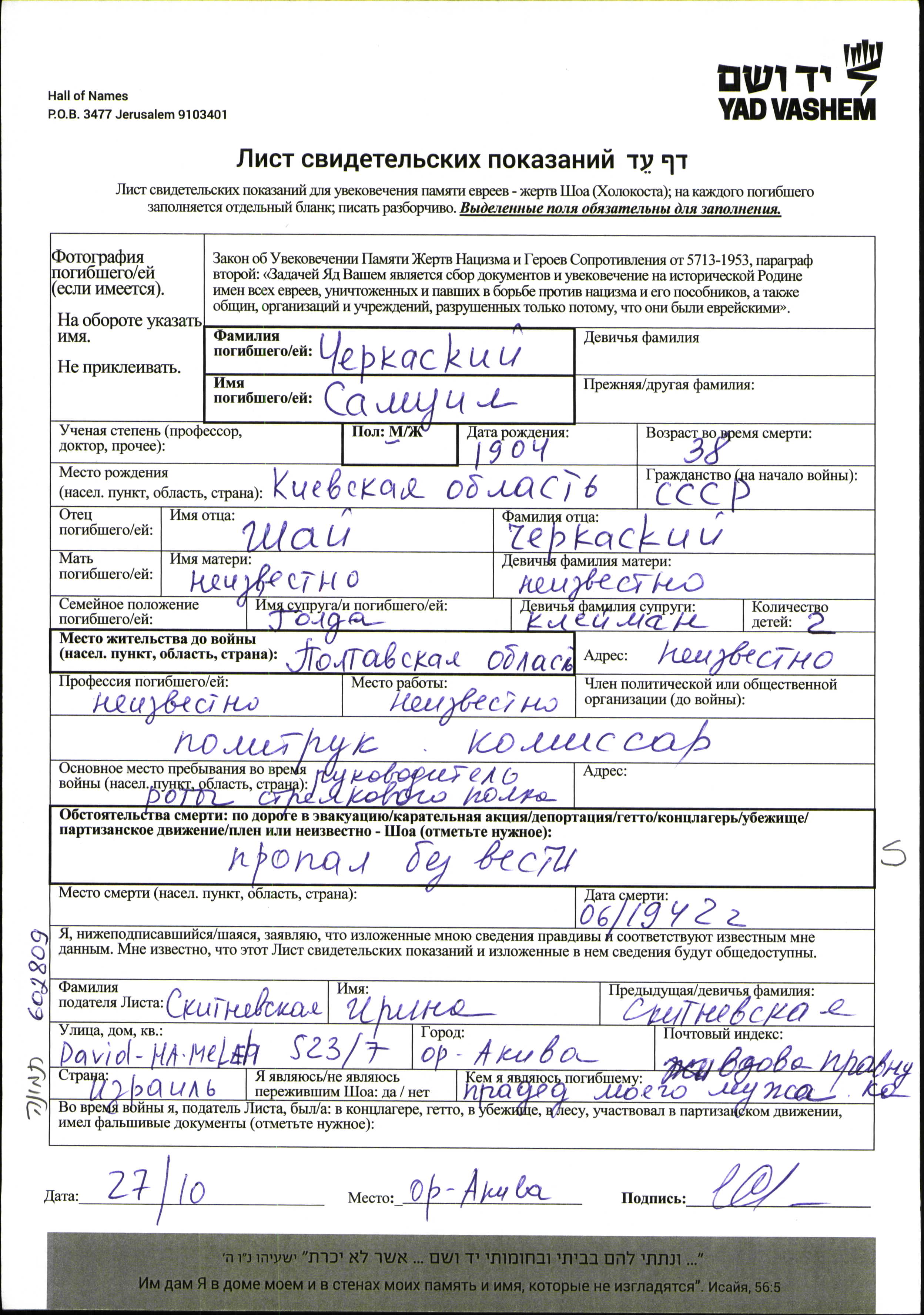 Samuil Cherkaski wurde im Jahr 1904 in Kiev, Ukraine (UdSSR) geboren. Er war Politoffizier. Vor dem Zweiten Weltkrieg lebte er in Poltava, Ukraine (UdSSR).