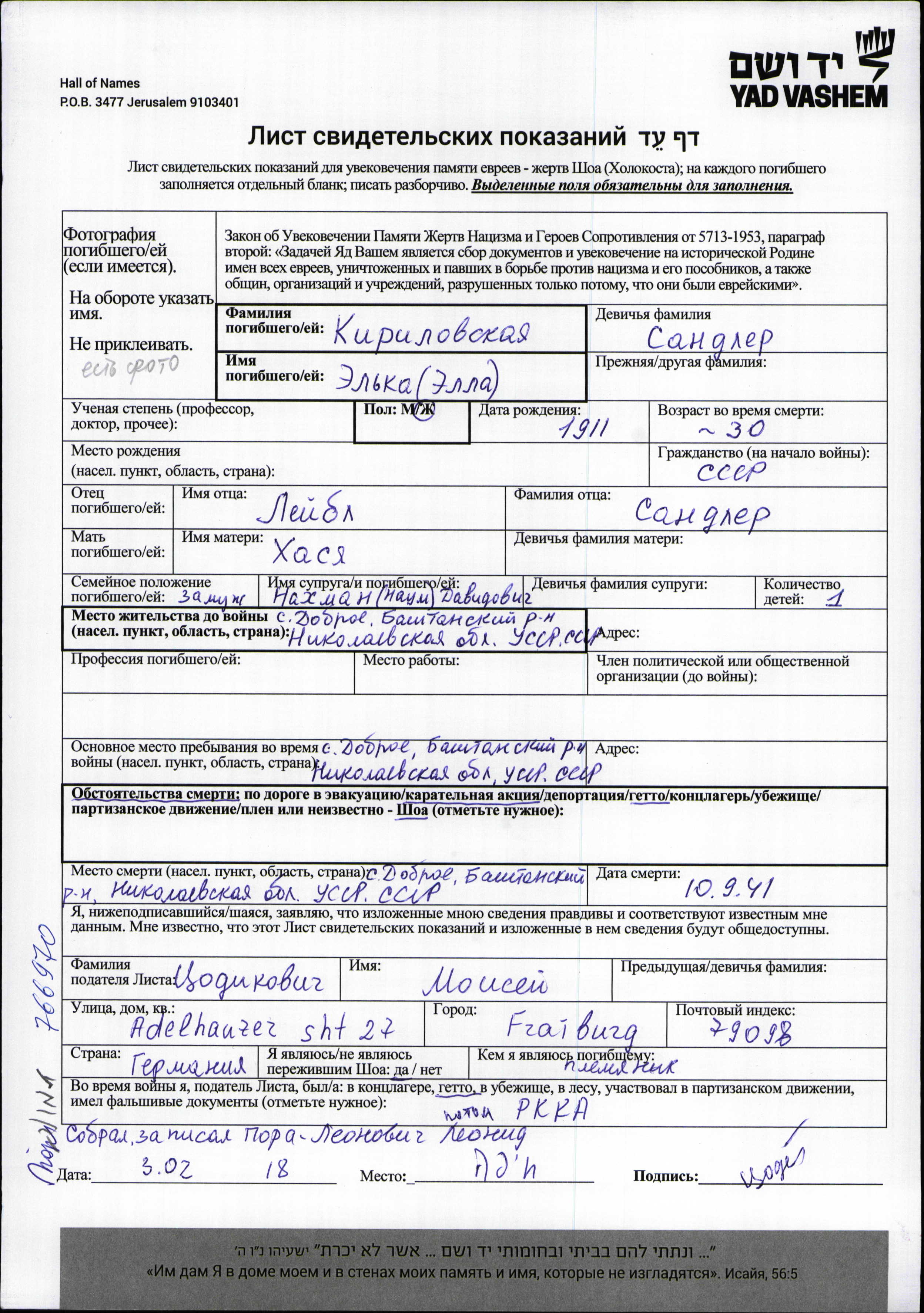 Ella Kirilovskaya, geb. Sandler wurde im Jahr 1911 geboren. Vor dem Zweiten Weltkrieg lebte sie in Dobraya, Ukraine (UdSSR).