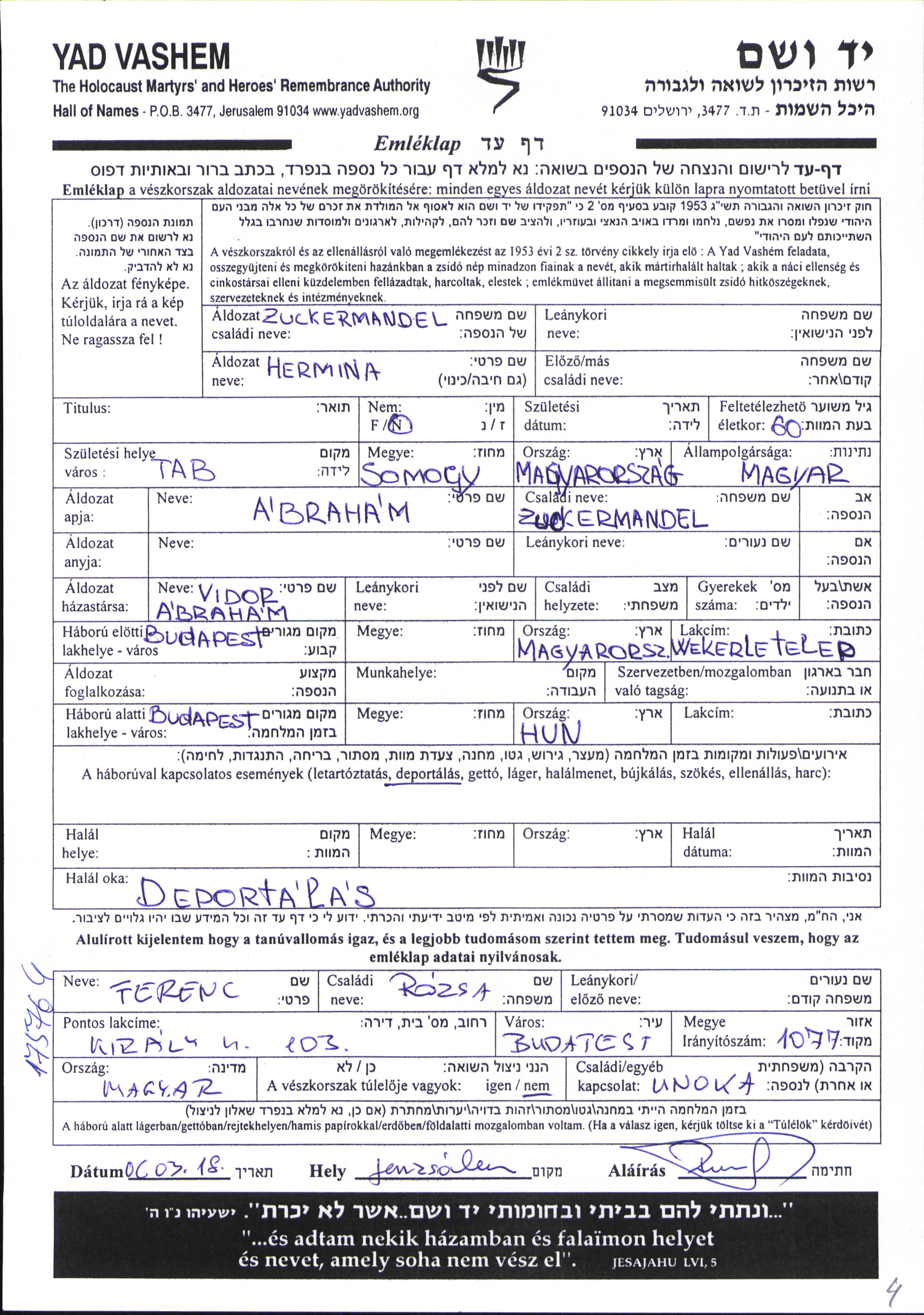 Hermina Vidor, geb. Zuckermandel wurde in Tab, Ungarn geboren. Vor dem Zweiten Weltkrieg lebte sie in Budapest, Ungarn.