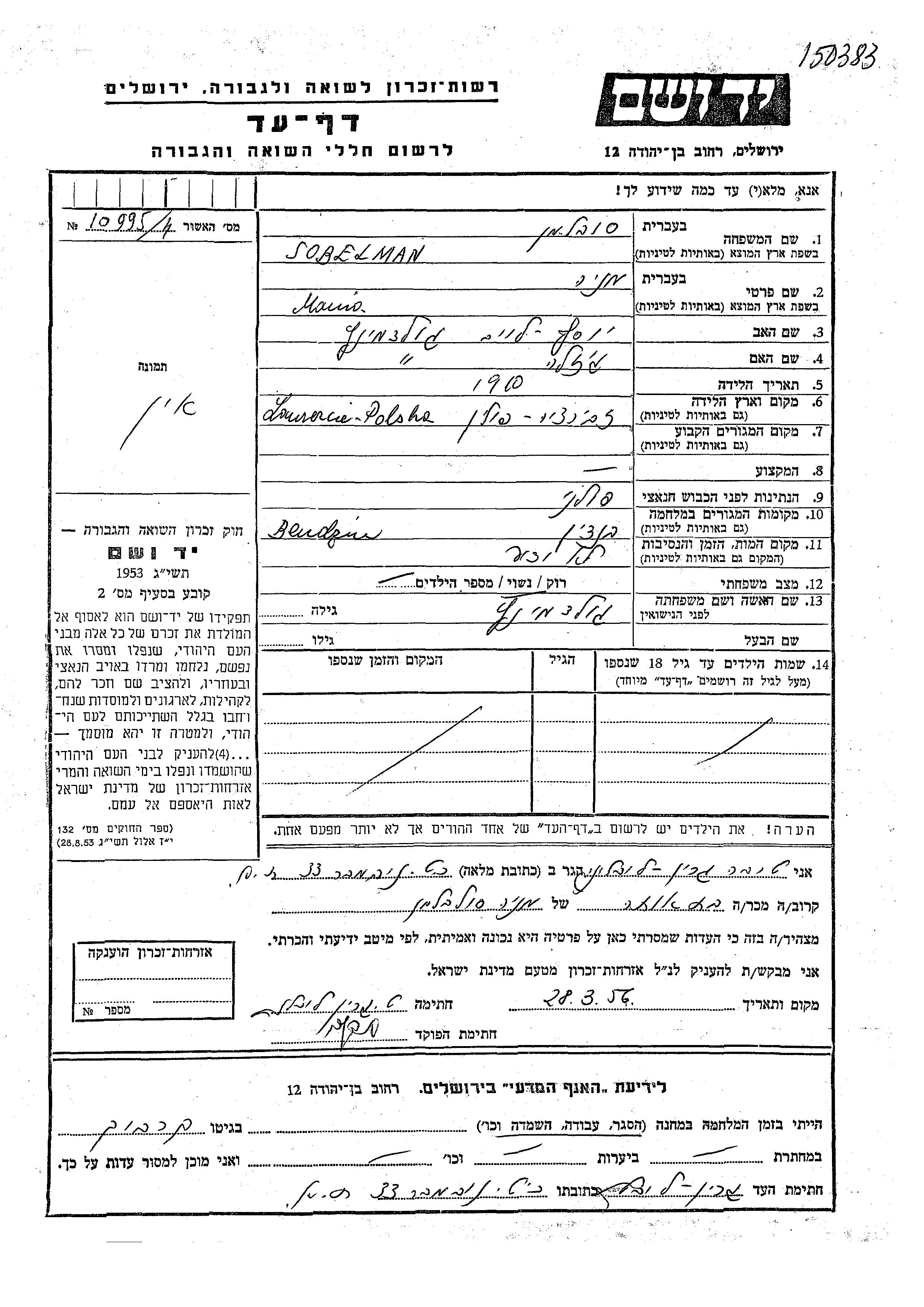 Mania Sobelman, geb. Goldmintz wurde im Jahr 1910 in Zawiercie, Polen geboren. Vor dem Zweiten Weltkrieg lebte sie in Kielce, Polen.