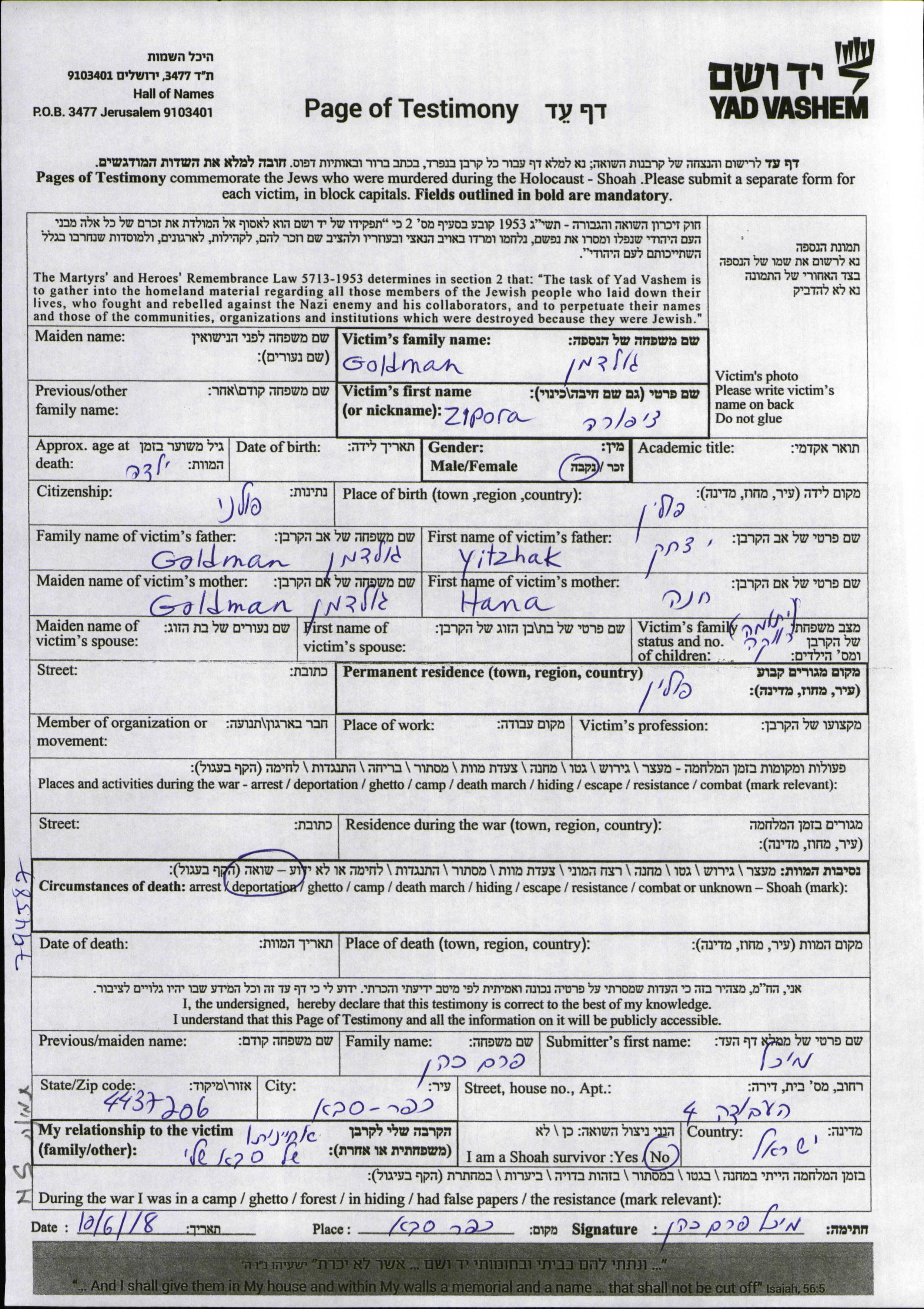 Goldman Zipora Polen Gedenkblatt