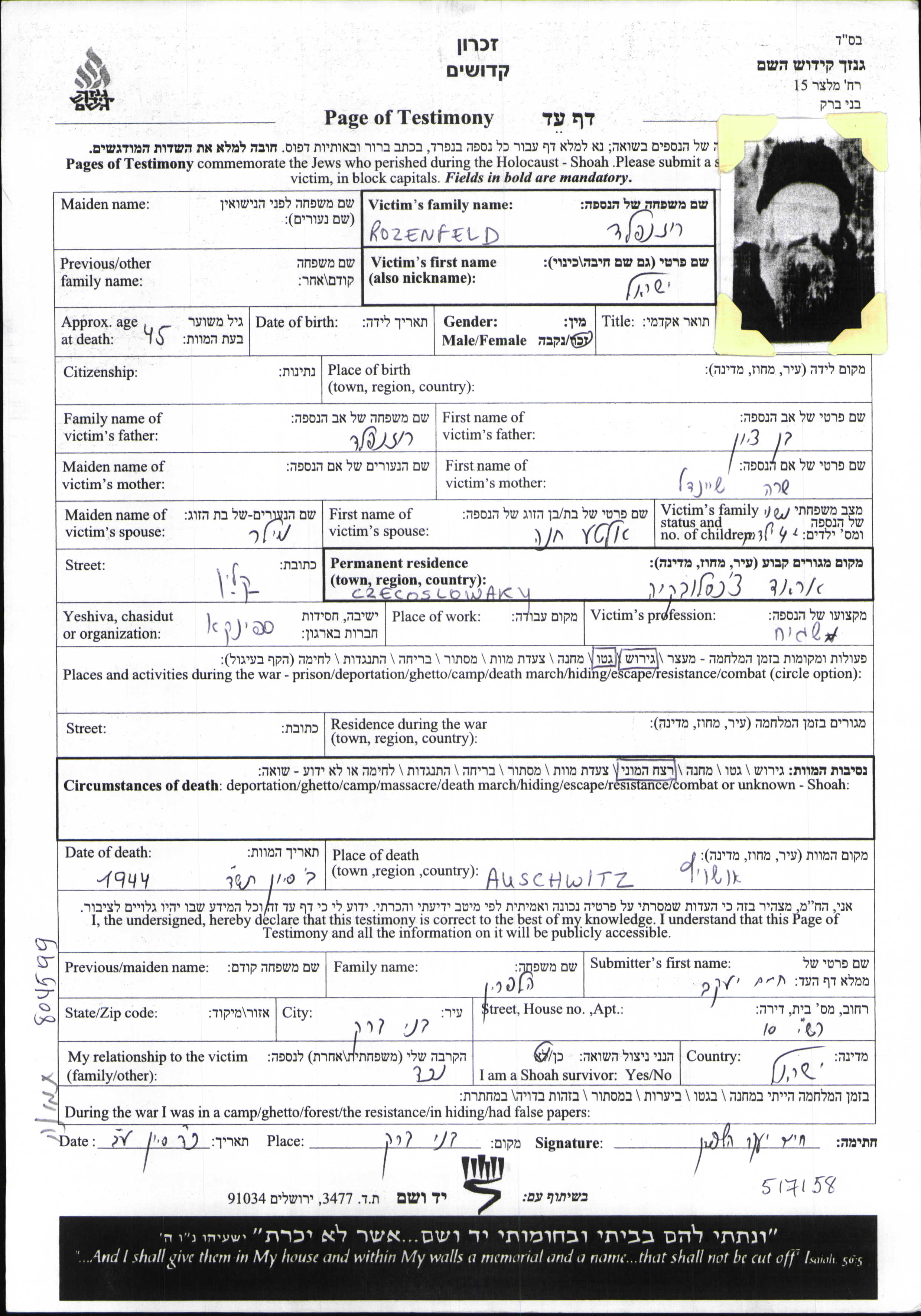 Yisrael Rozenfeld. Er war Inspektor. Vor dem Zweiten Weltkrieg lebte er in Kaliny, Tschechoslowakei.