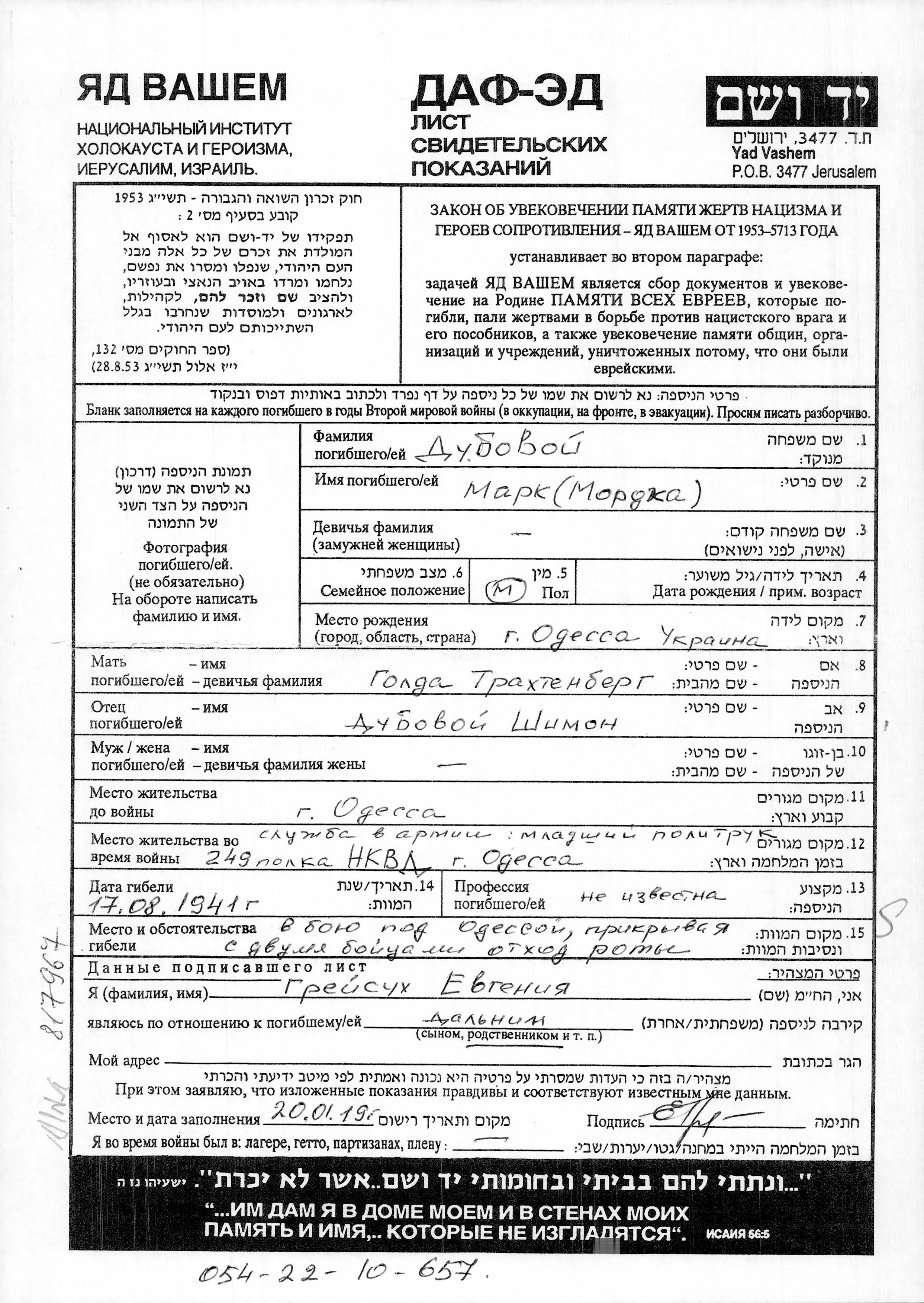 Dubovoy Mark Mordka Odessa, Ukraine (UdSSR) Gedenkblatt