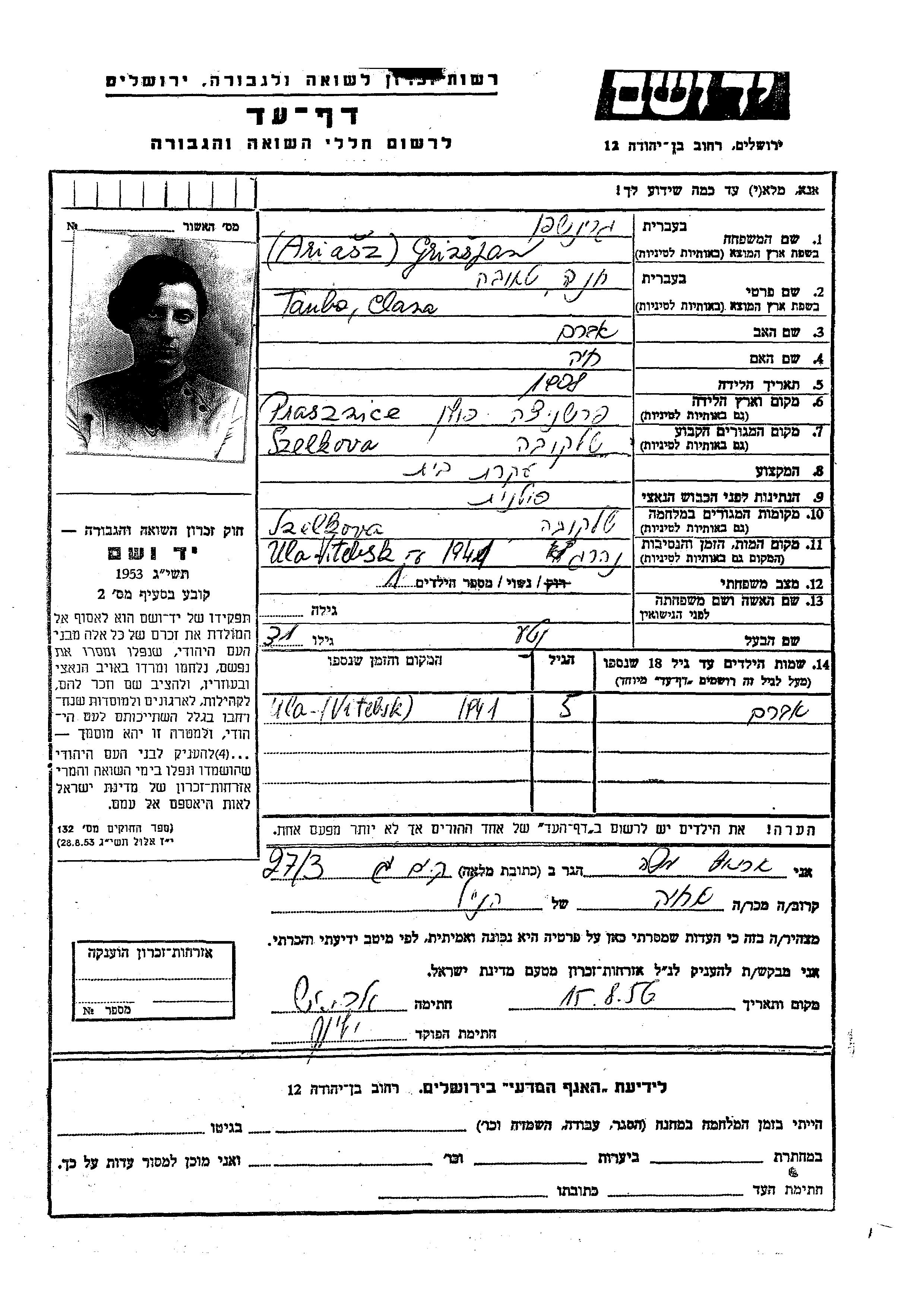 | Grinshpan | Tauba Chana Tova | 1908 | Szelkow, Polen | Gedenkblatt |