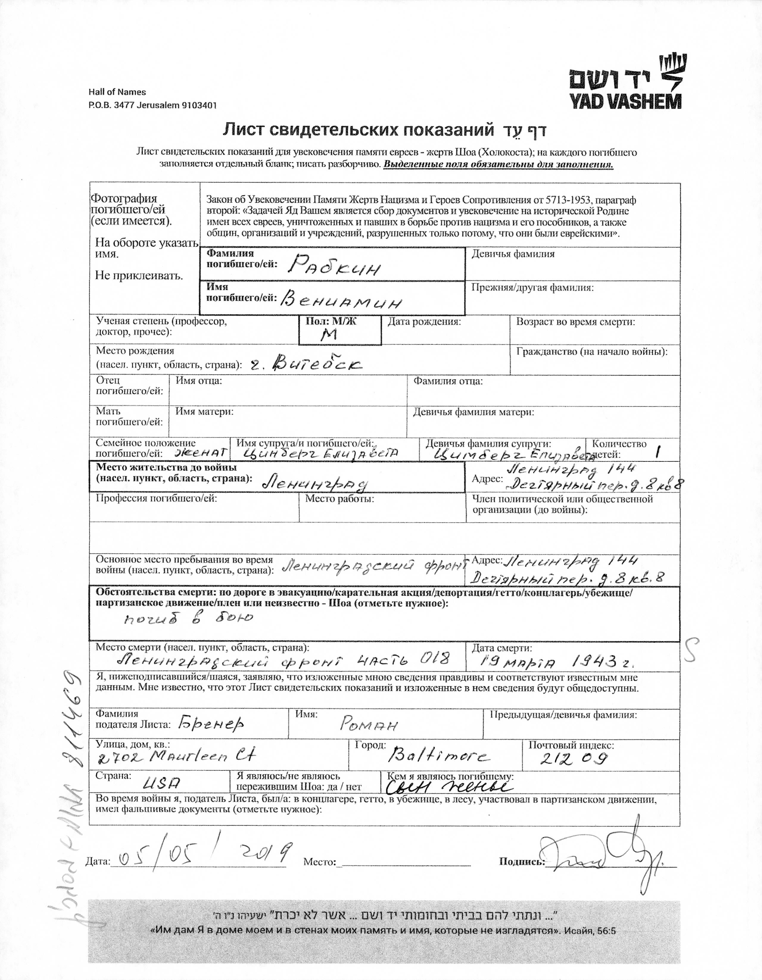 Veniamin Rabkin wurde in Vitebsk, Weißrussland (UdSSR) geboren. Vor dem Zweiten Weltkrieg lebte er in Leningrad, Russland (UdSSR).