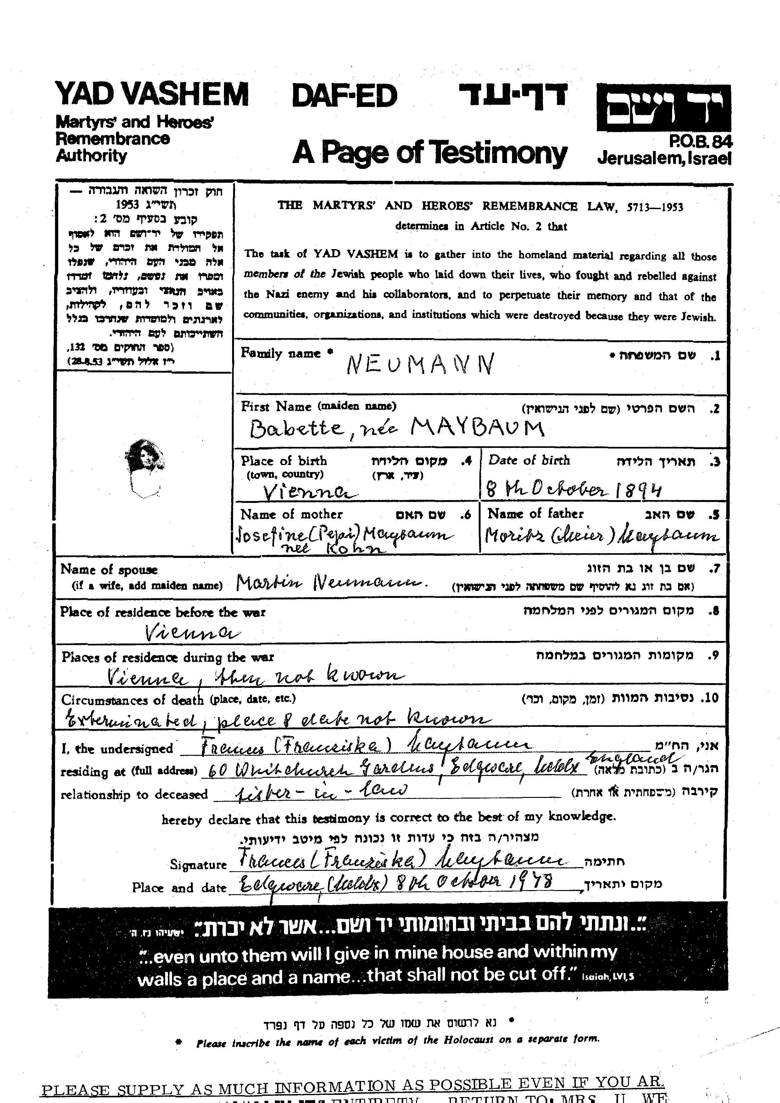 Neumann Kohn Babette 1894 Vienna, Österreich Gedenkblatt