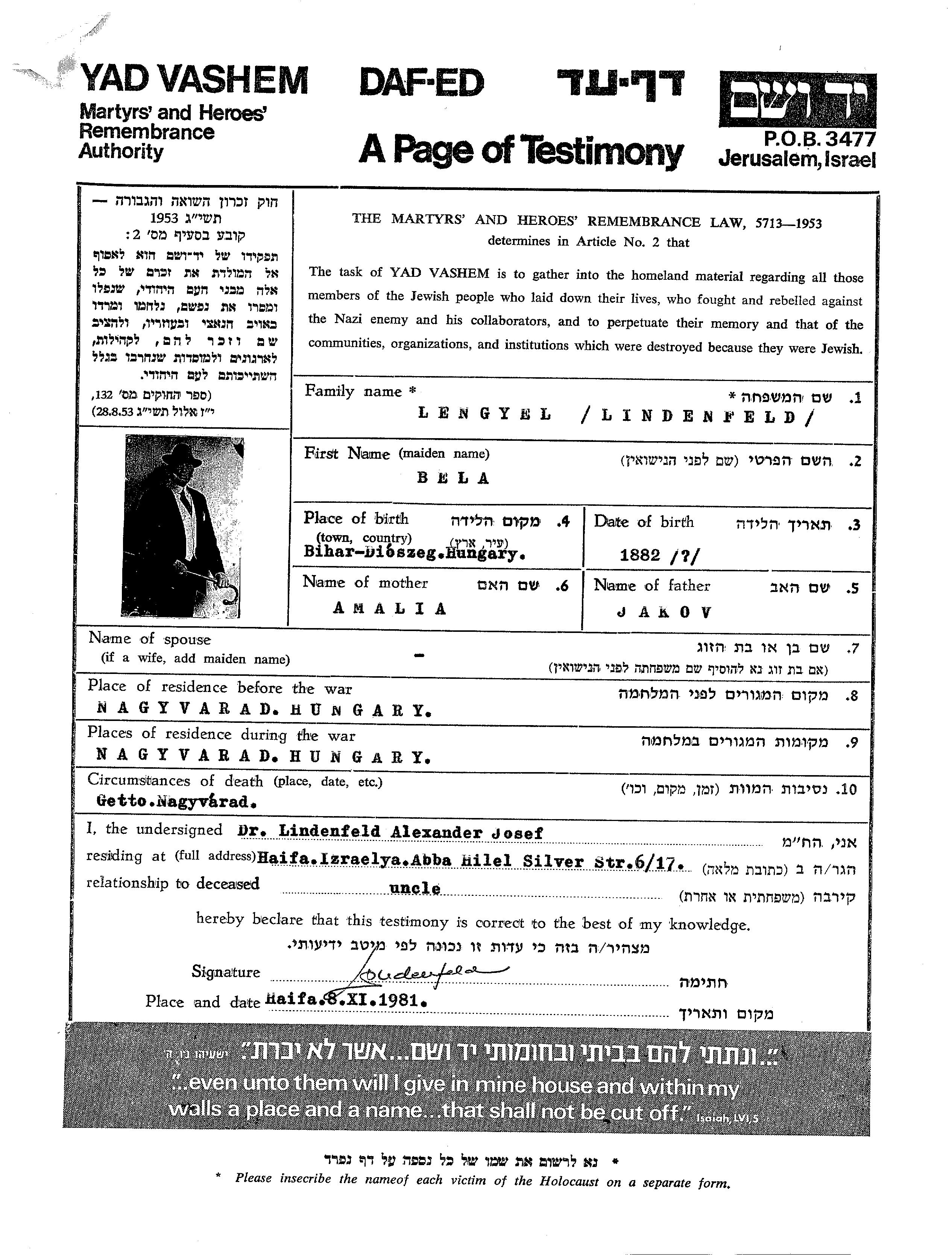 Bela Lengyel Lindenfeld wurde im Jahr 1882 in Diosig, Rumänien geboren. Vor dem Zweiten Weltkrieg lebte er in Oradea, Rumänien.