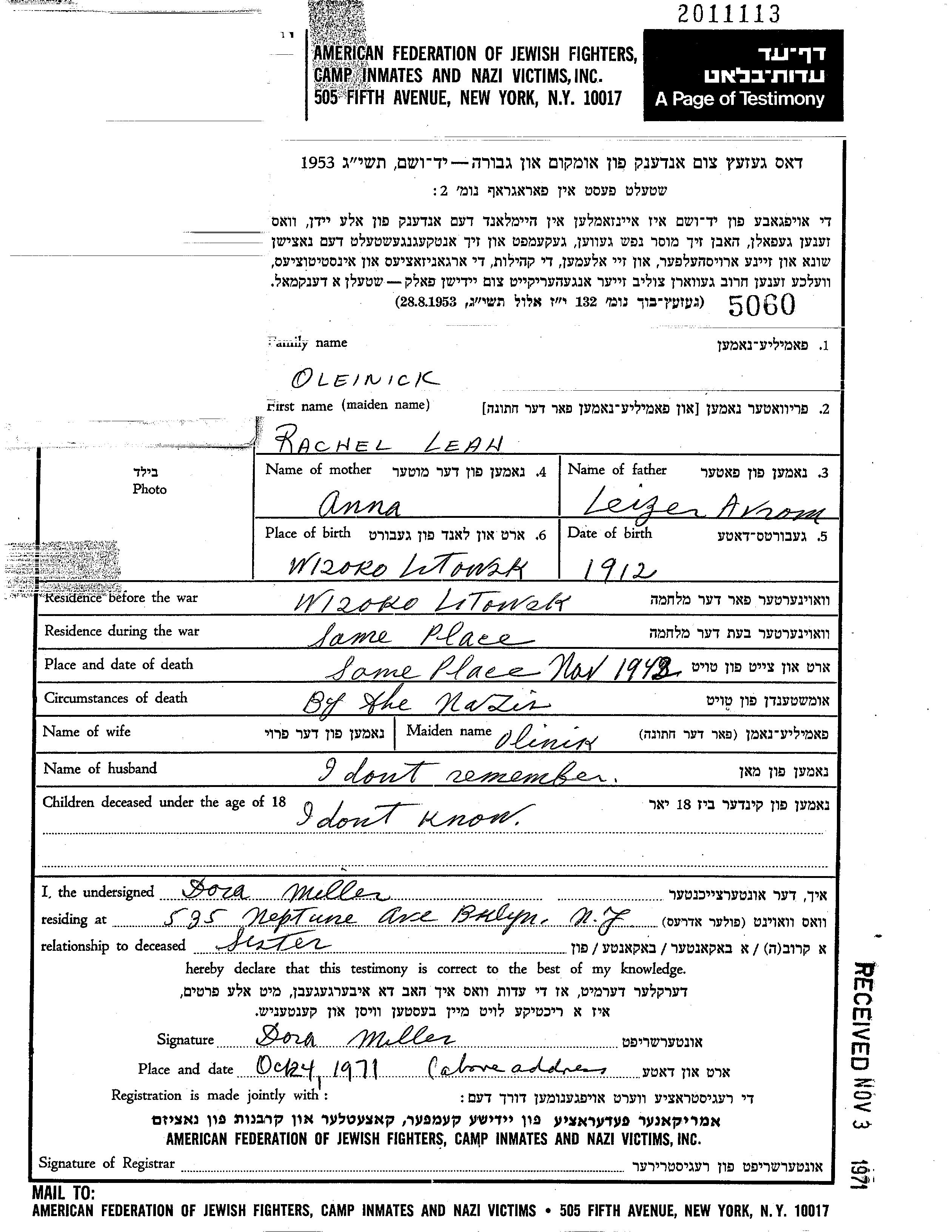 Rachel Leah Name unbekannt, geb. Oleinick wurde im Jahr 1912 in Wysokie Litewskie, Polen geboren. Vor dem Zweiten Weltkrieg lebte sie in Wysokie Litewskie, Polen.