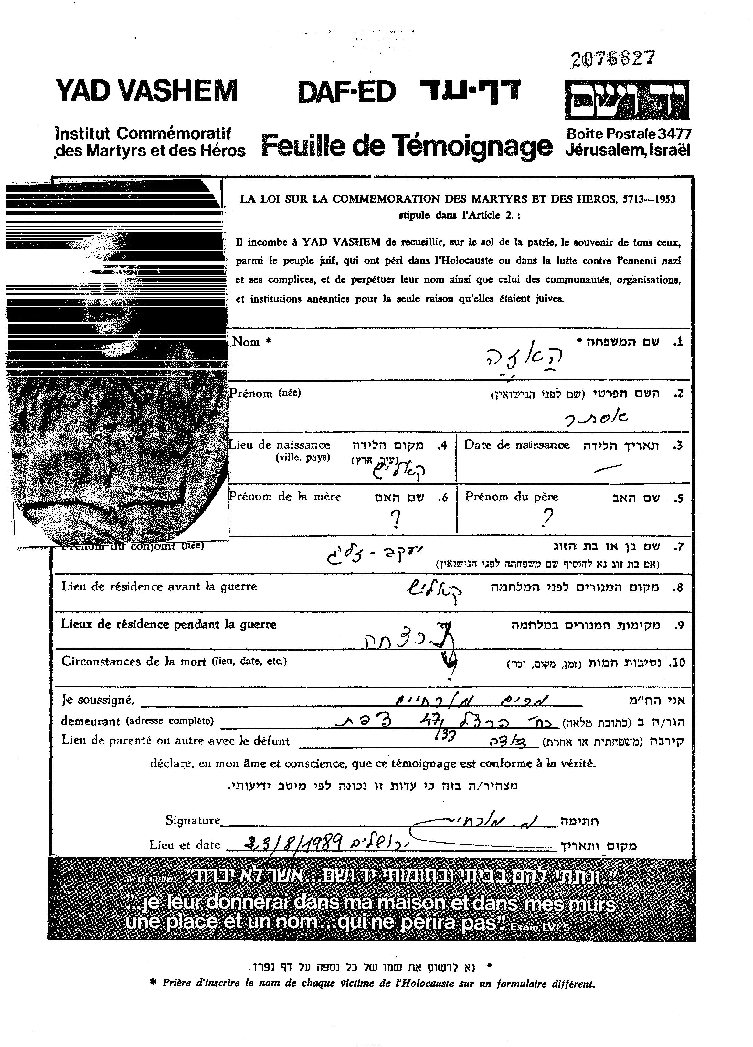Ester wurde in der Schoah ermordet. Todesort: unbekannter Ort.