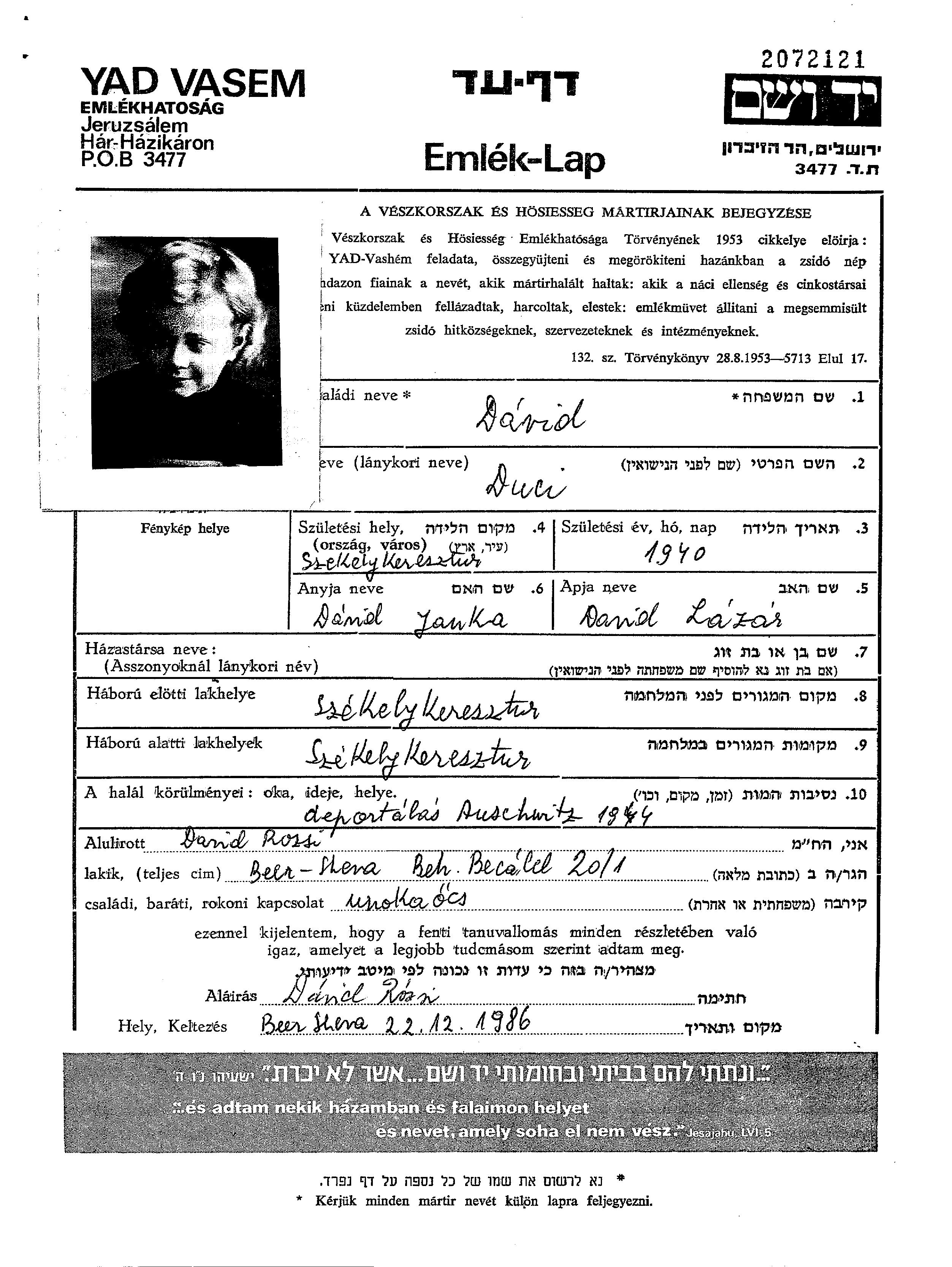 David Duci 1940 Szekelykeresztur, Rumänien Gedenkblatt