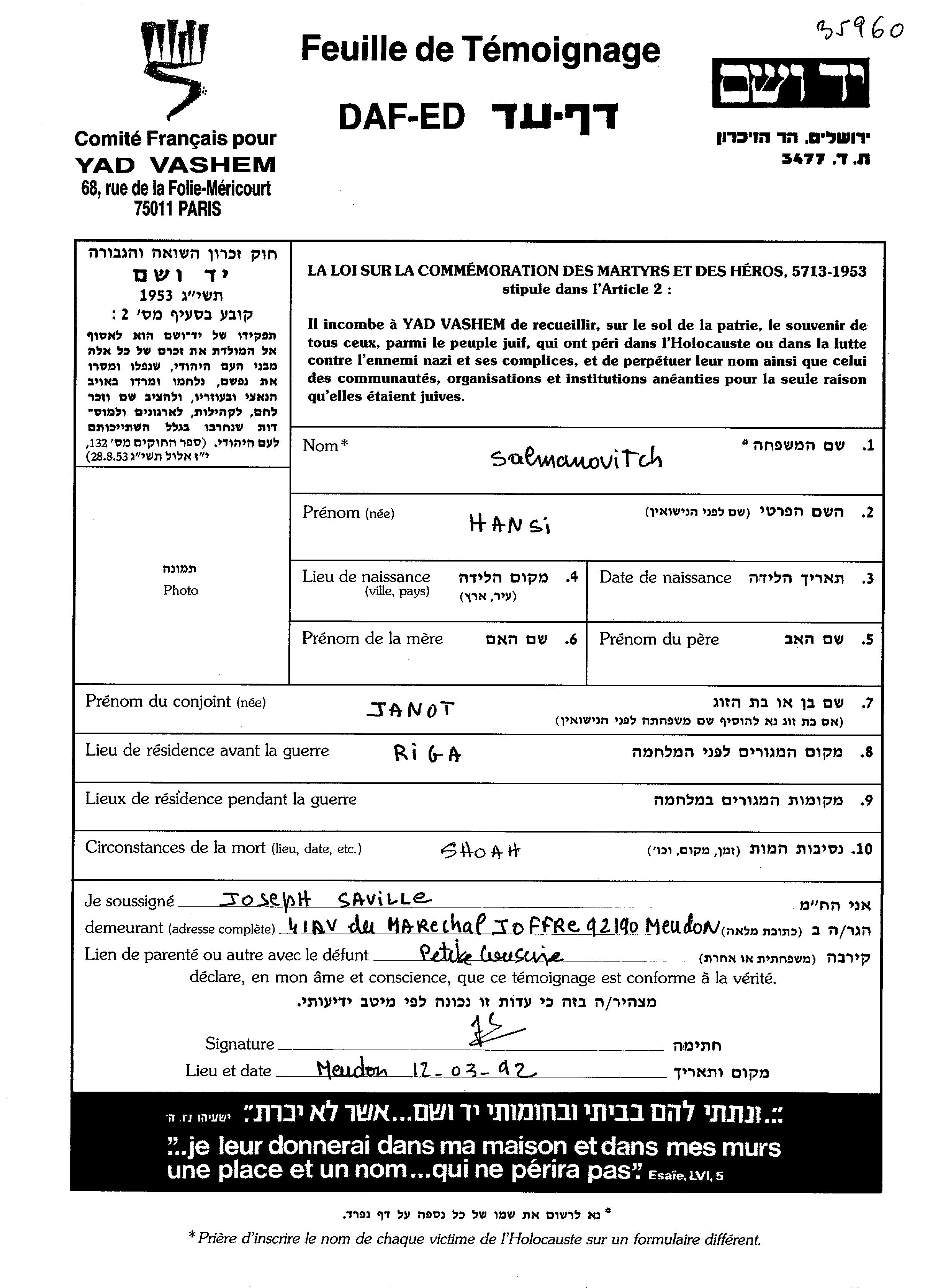 Salmanovitch Selmanovitz Hansi Riga, Lettland Gedenkblatt