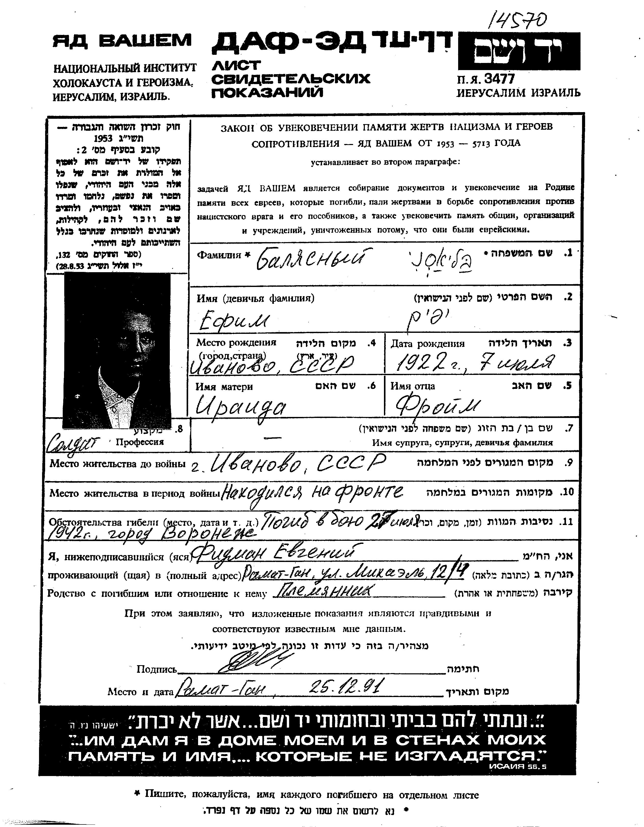 Balyasny | Yefim | 1922 | Ivanovo, Russland (UdSSR) | Gedenkblatt |