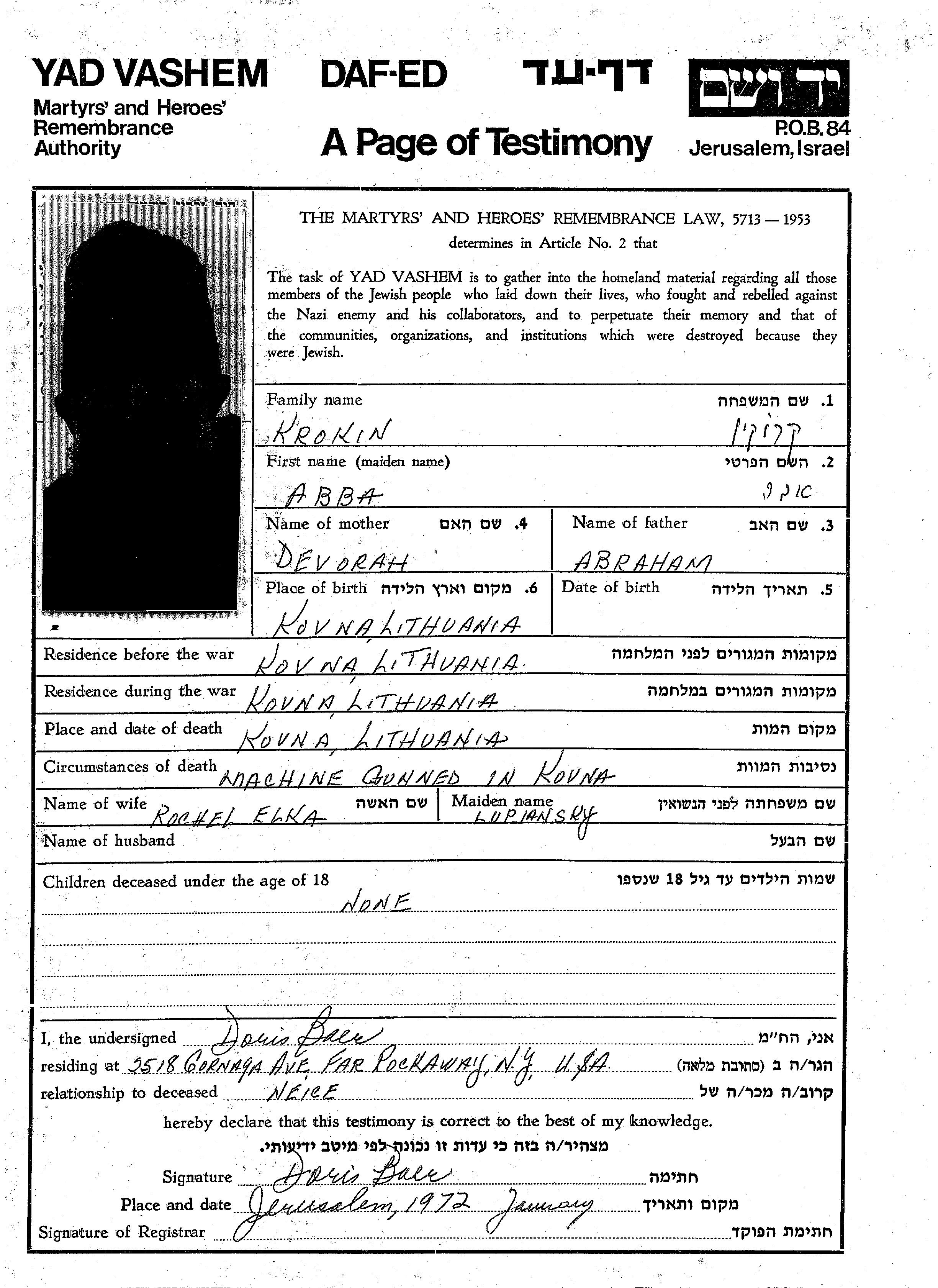 Aba Krokin wurde in Kaunata, Lettland geboren. Vor dem Zweiten Weltkrieg lebte er in Kaunata, Lettland.
