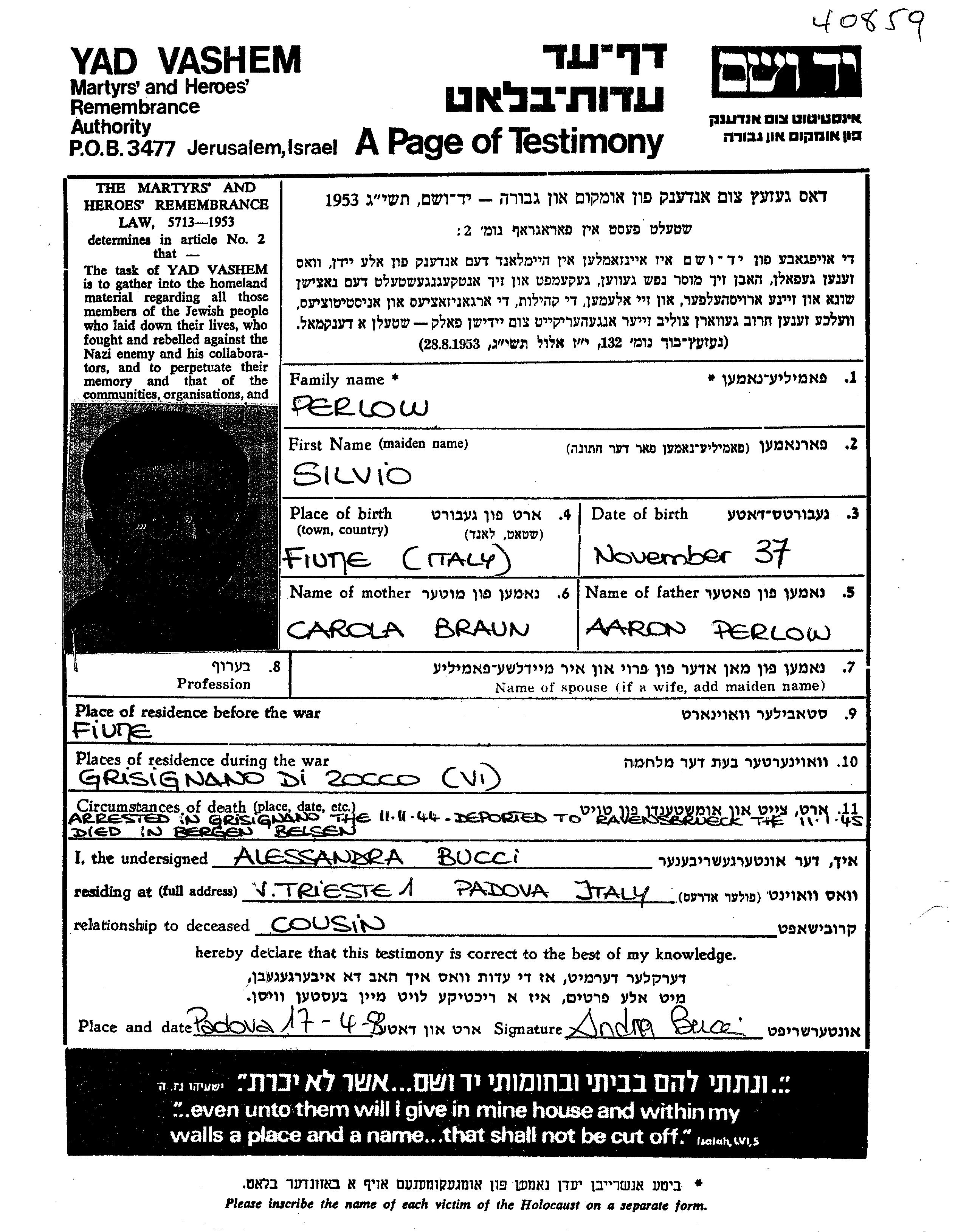 Silvio wurde in der Schoah ermordet. Todesort: Bergen Belsen, Deutsches Reich im Jahr 1945.