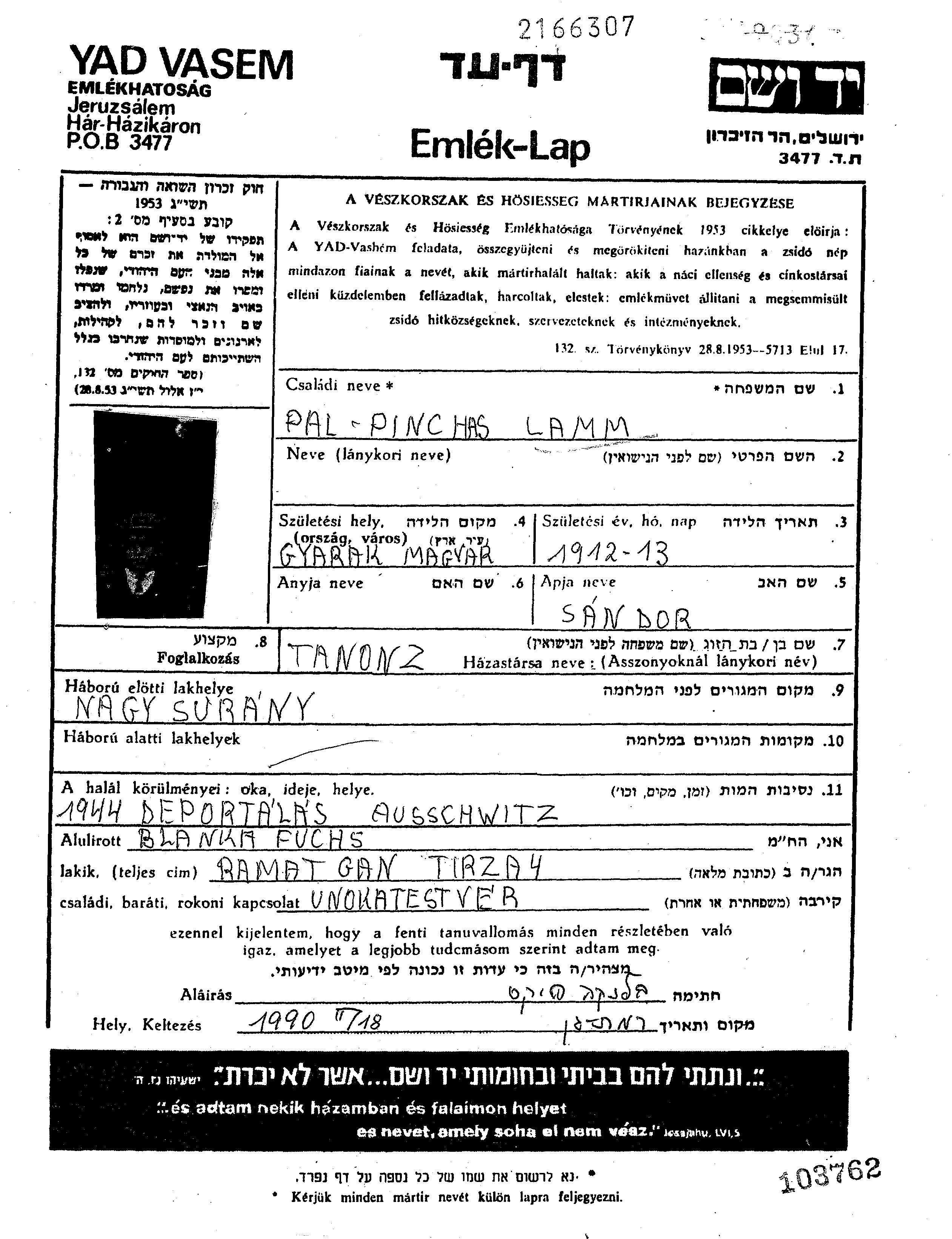 Lamm Pal Pinchas 1912 Nagysurany, Tschechoslowakei Gedenkblatt