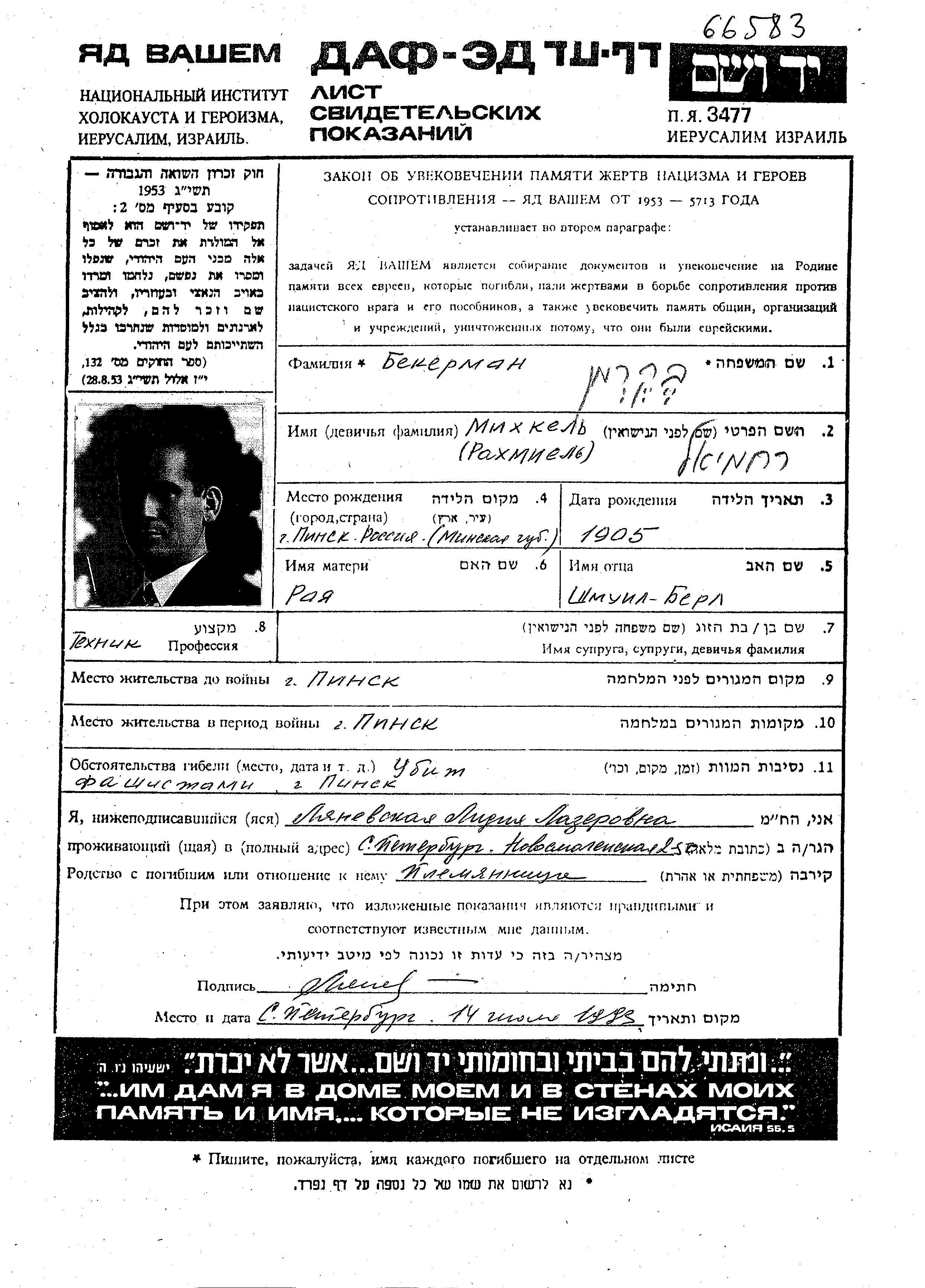Mikhkel Rakhmiyel Bekerman wurde im Jahr 1905 in Pinsk, Polen geboren. Er war Techniker/-in. Vor dem Zweiten Weltkrieg lebte er in Pinsk, Polen.