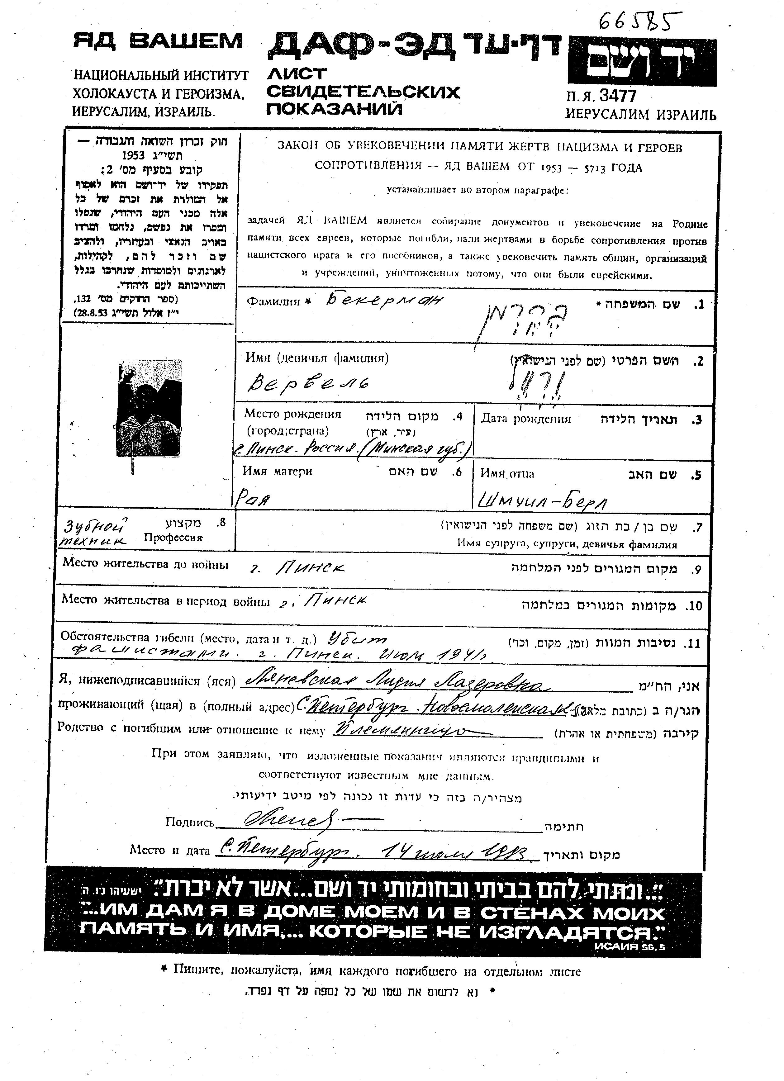 Vervel Bekerman wurde in Pinsk, Polen geboren. Er war Zahntechniker/-in. Vor dem Zweiten Weltkrieg lebte er in Pinsk, Polen.