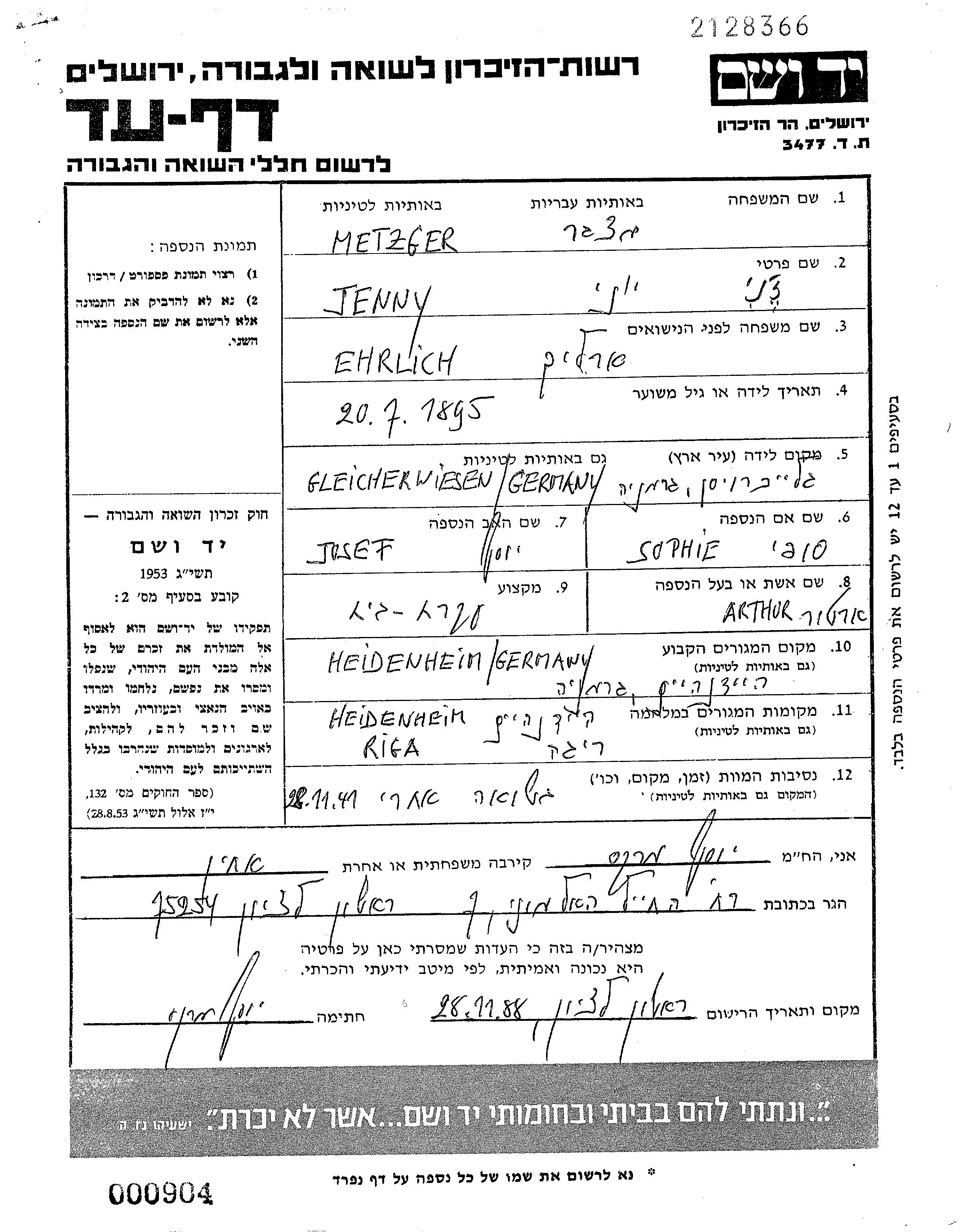 Jenny Ieni Metzger, geb. Ehrlich wurde im Jahr 1895 in Gleicherwiesen, Deutsches Reich geboren. Sie war Hausfrau. Vor dem Zweiten Weltkrieg lebte sie in Heidenheim, Deutsches Reich.