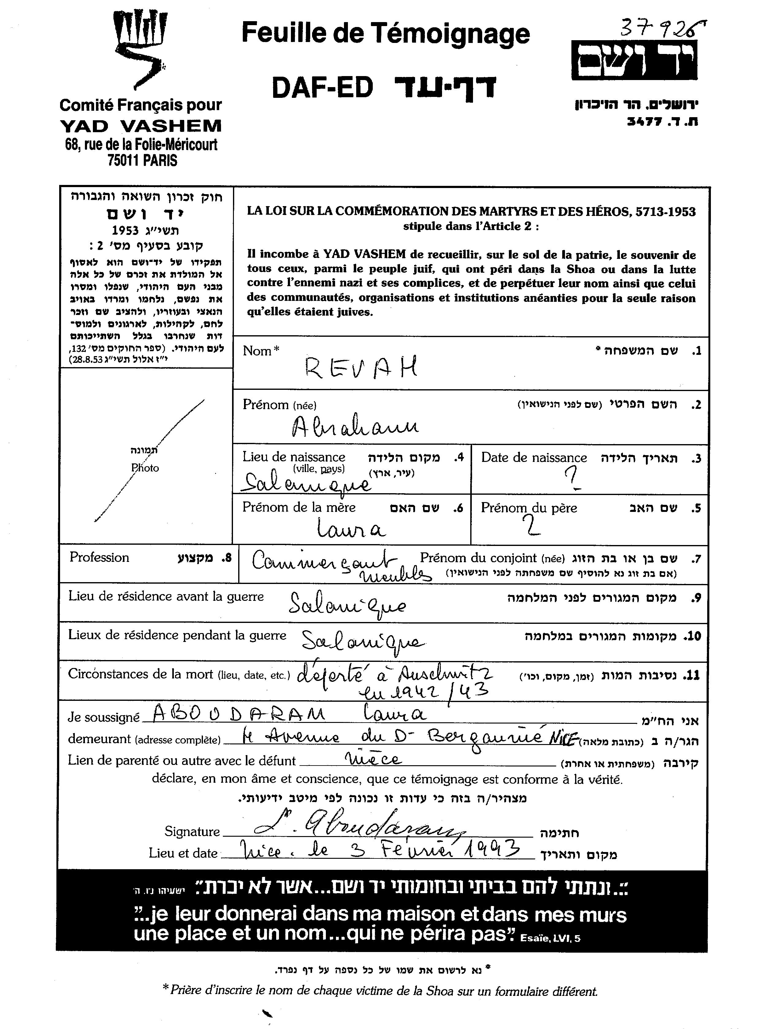 Abraham Revah wurde in Saloniki, Griechenland geboren. Er war der Sohn von Laura. Er war Kaufmann/-frau und mit Caroline Verheiratet. Vor dem Zweiten Weltkrieg lebte er in Saloniki, Griechenland. Während des Krieges war er in Saloniki, Griechenland.