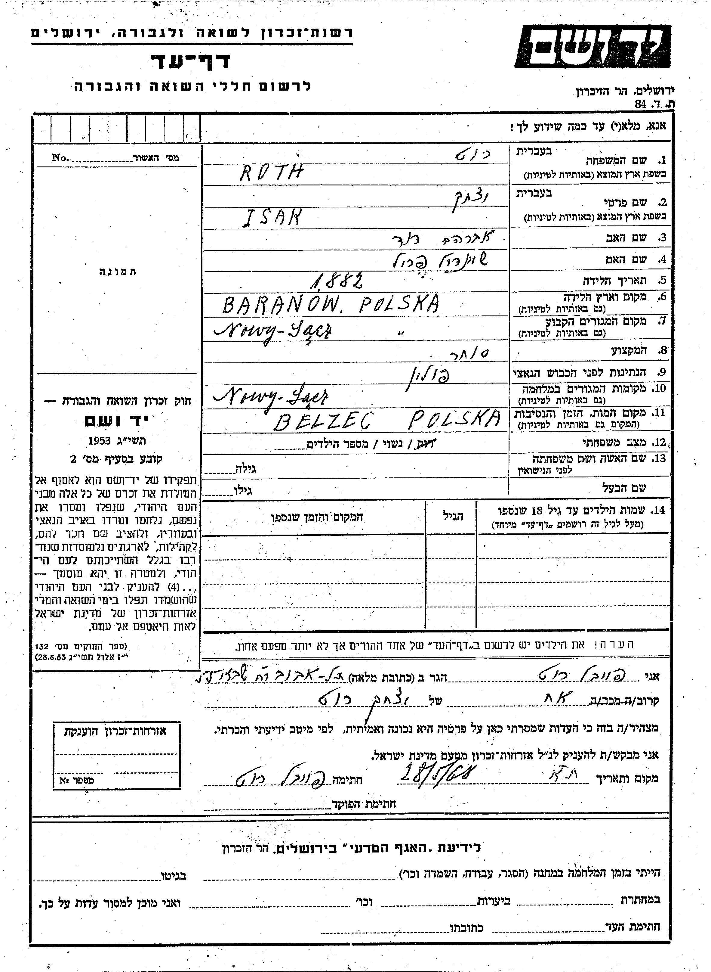 Isak Roth Rut wurde im Jahr 1882 in Baranów, Polen geboren. Er war Kaufmann/-frau. Vor dem Zweiten Weltkrieg lebte er in Nowy Sacz, Polen.