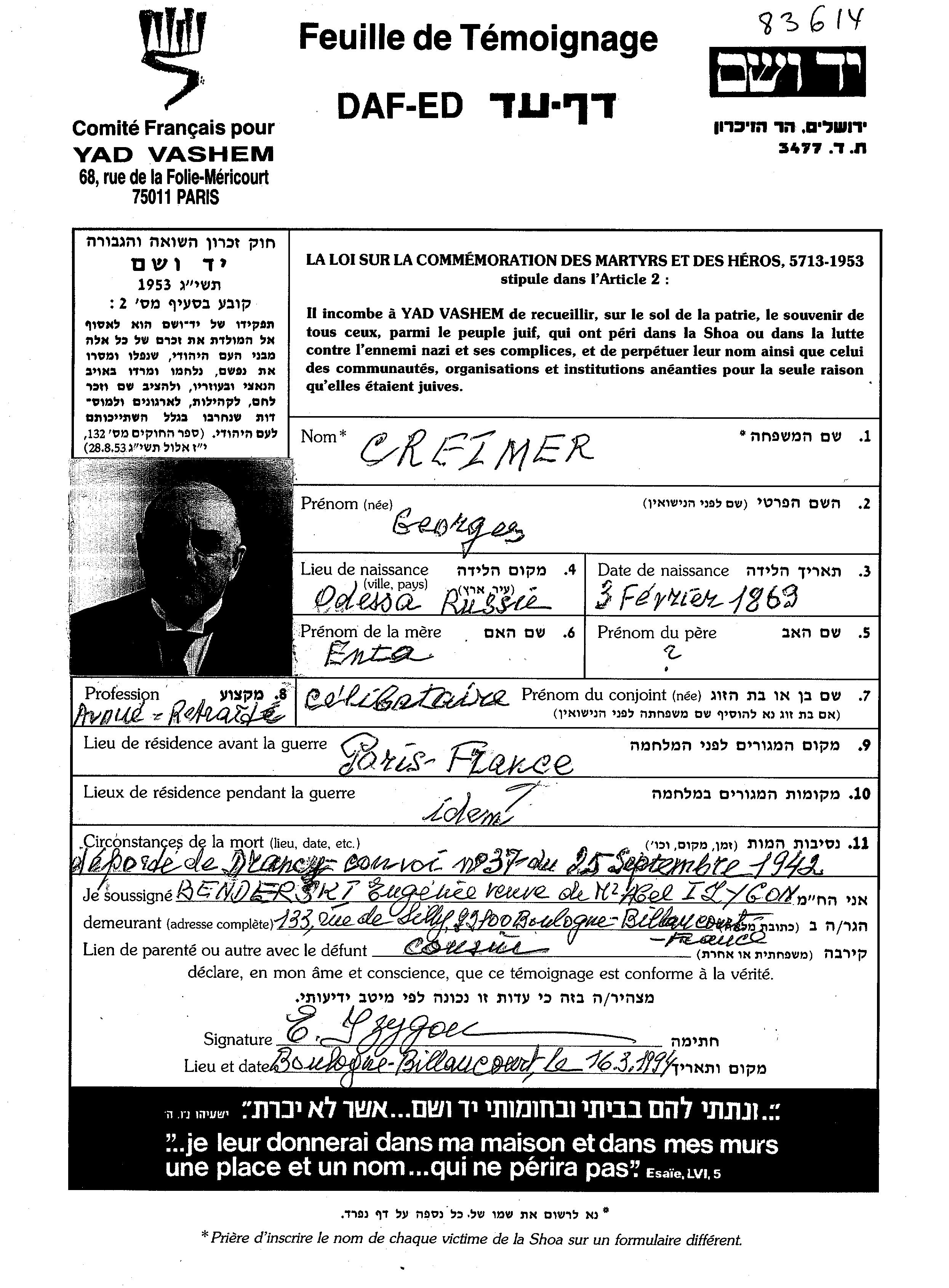 Georges Creimer wurde im Jahr 1869 in Odessa, Ukraine (UdSSR) geboren. Er war Rentner/-in. Vor dem Zweiten Weltkrieg lebte er in Paris, Frankreich.