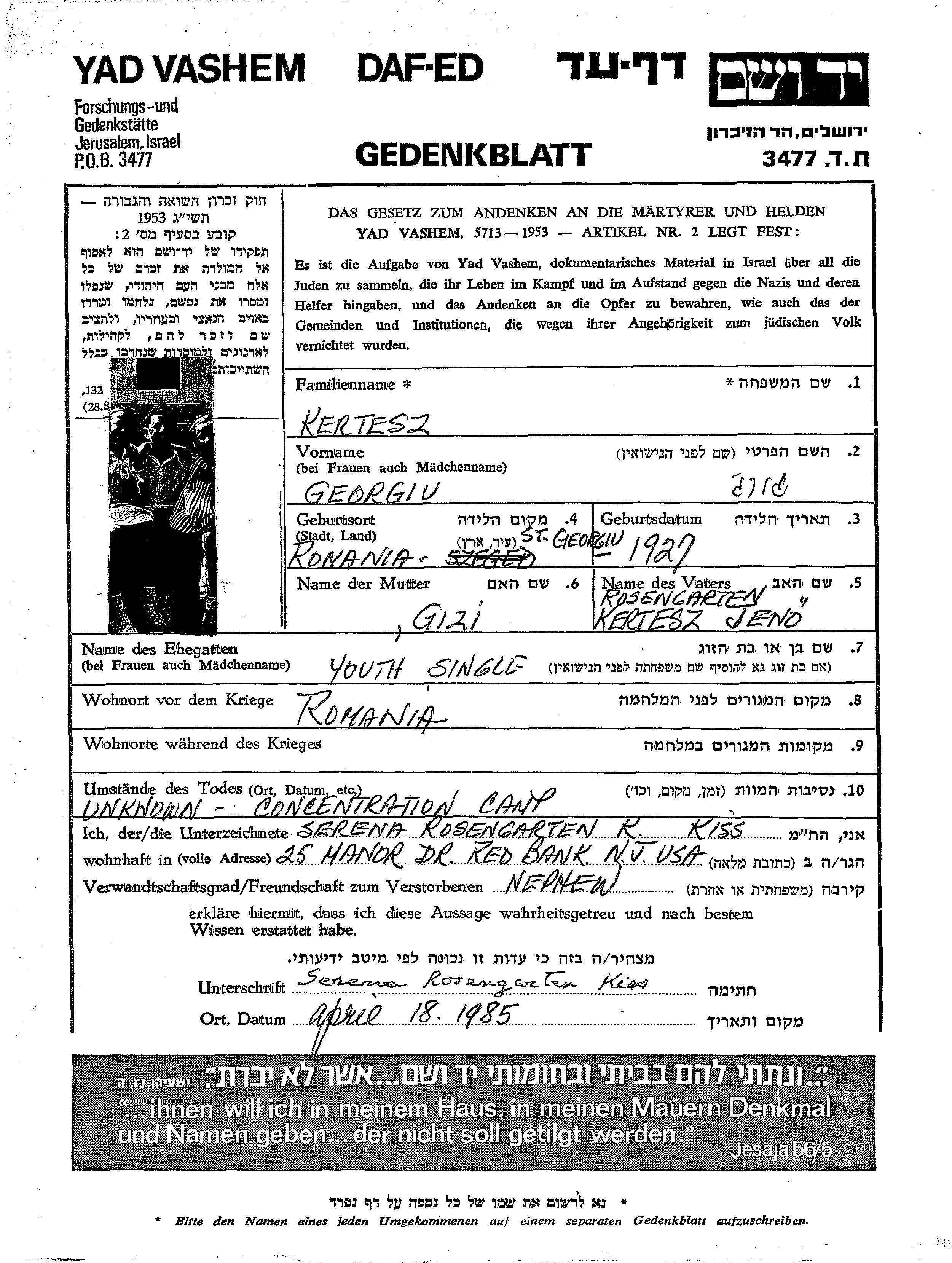 Georgiu Kertesz wurde im Jahr 1927 in Rumänien geboren. Vor dem Zweiten Weltkrieg lebte er in Rumänien.