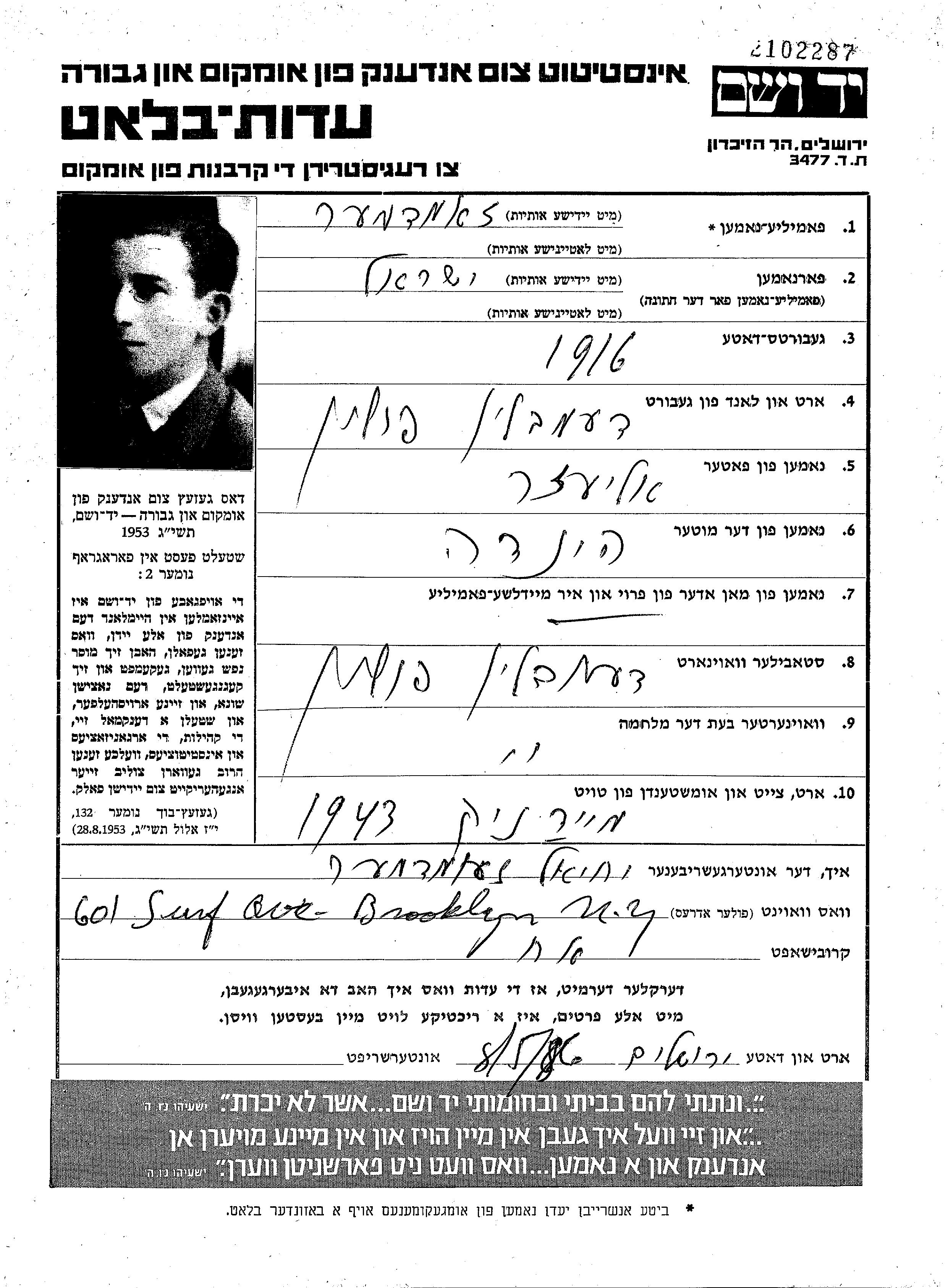 Israel Zamdmer wurde im Jahr 1916 in Demblin, Polen geboren. Vor dem Zweiten Weltkrieg lebte er in Demblin, Polen.