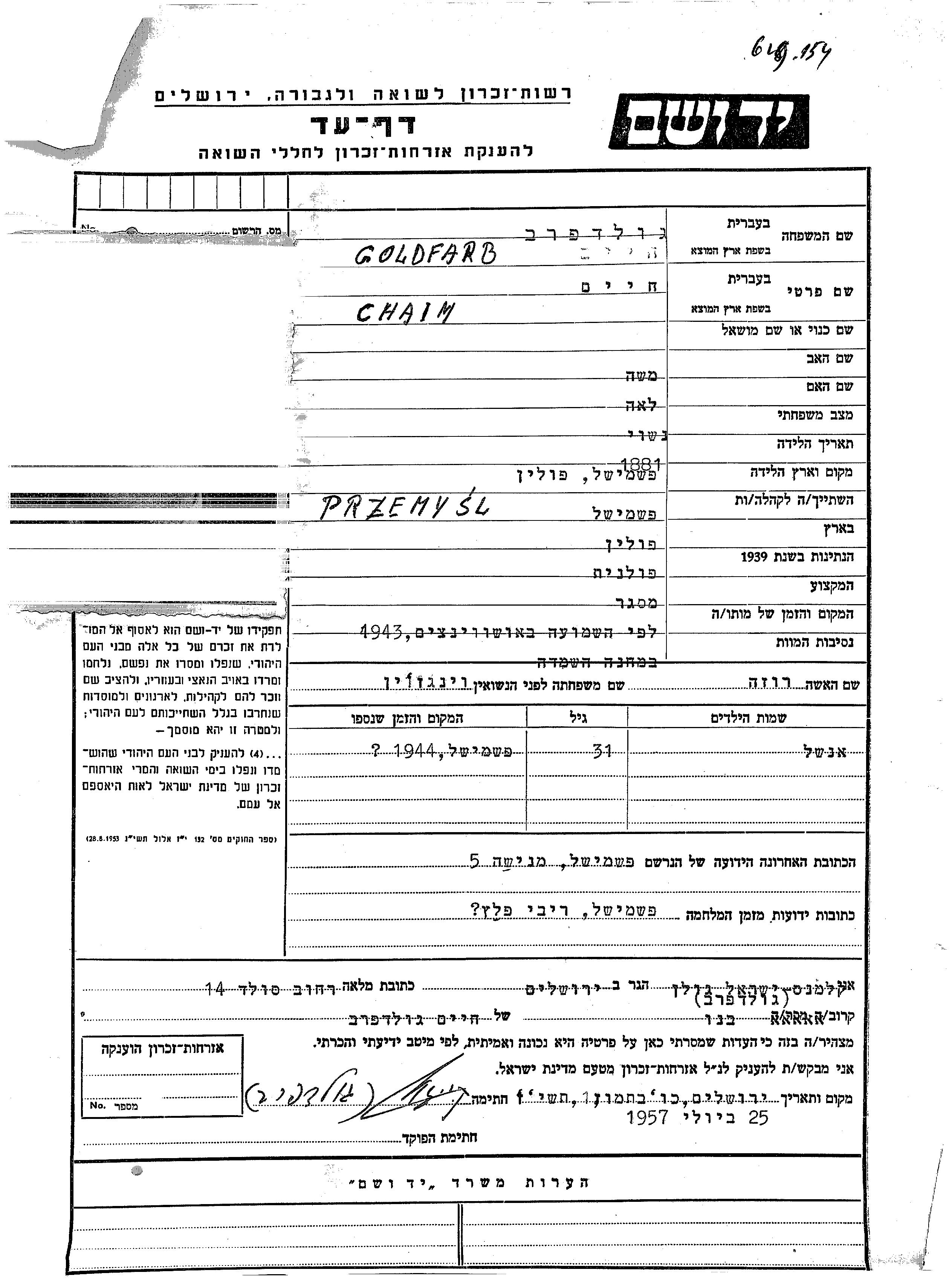 Chaim Goldfarb wurde im Jahr 1881 in Przemysl, Polen geboren. Er war Schlosser. Vor dem Zweiten Weltkrieg lebte er in Przemysl, Polen.