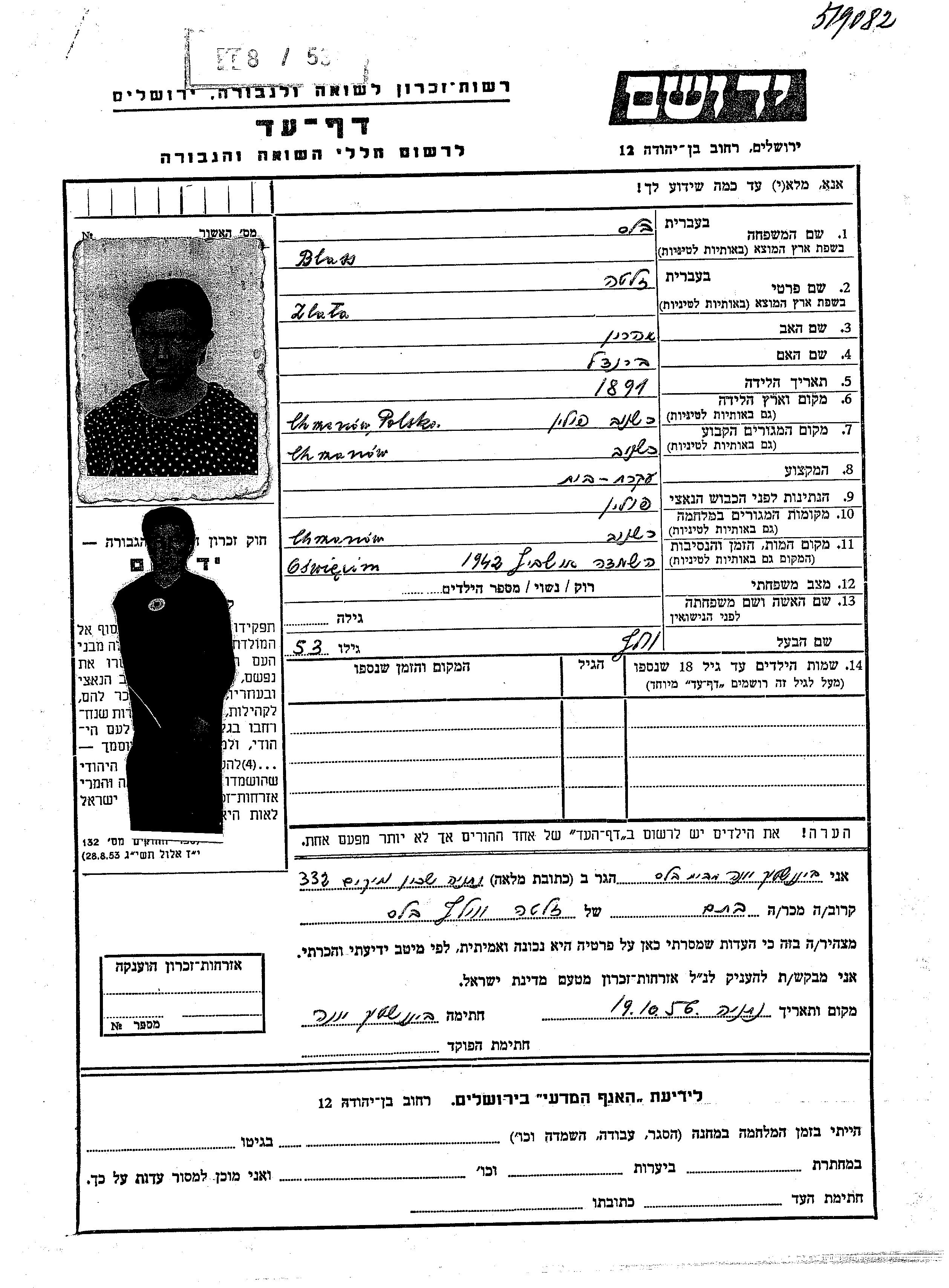 Zlata Blass wurde im Jahr 1891 in Chrzanow, Polen geboren. Sie war Hausfrau. Vor dem Zweiten Weltkrieg lebte sie in Chrzanow, Polen.