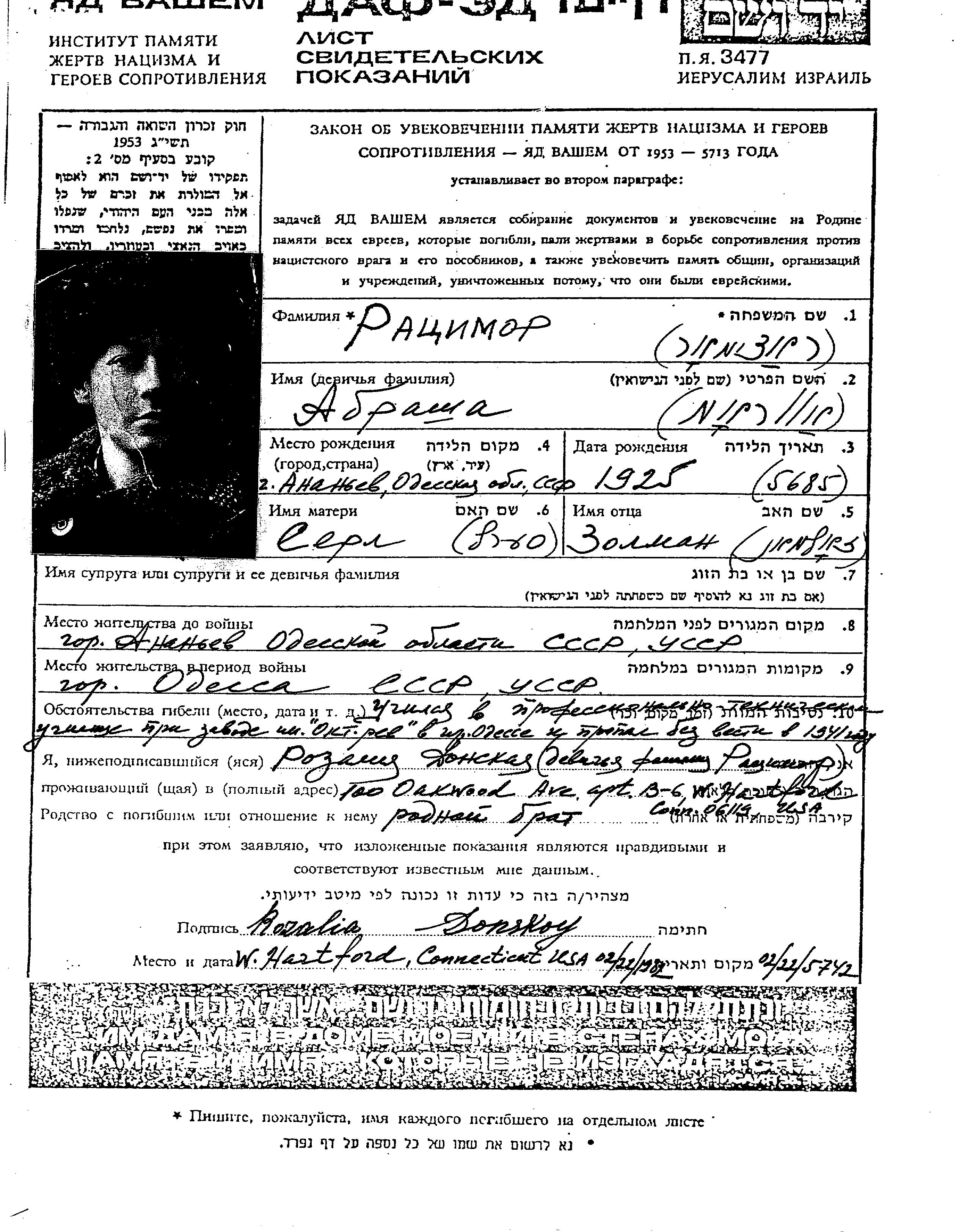 Ratzimora | Abrasha | 1925 | Ananyev, Ukraine (UdSSR) | Gedenkblatt |