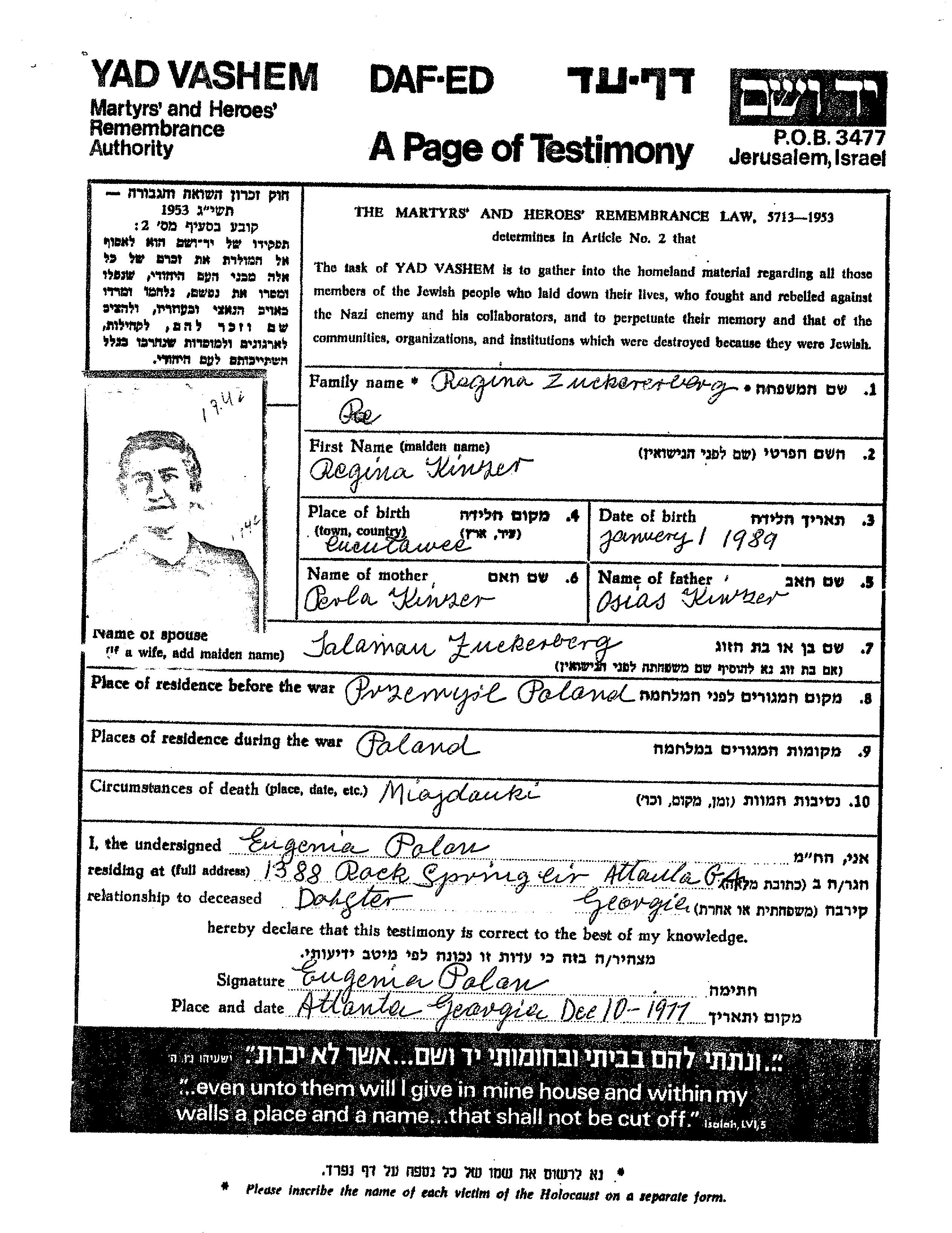 Regina Zuckerberg, geb. Kinzer wurde im Jahr 1889 in Cuculowce, Polen geboren. Vor dem Zweiten Weltkrieg lebte sie in Przemysl, Polen.