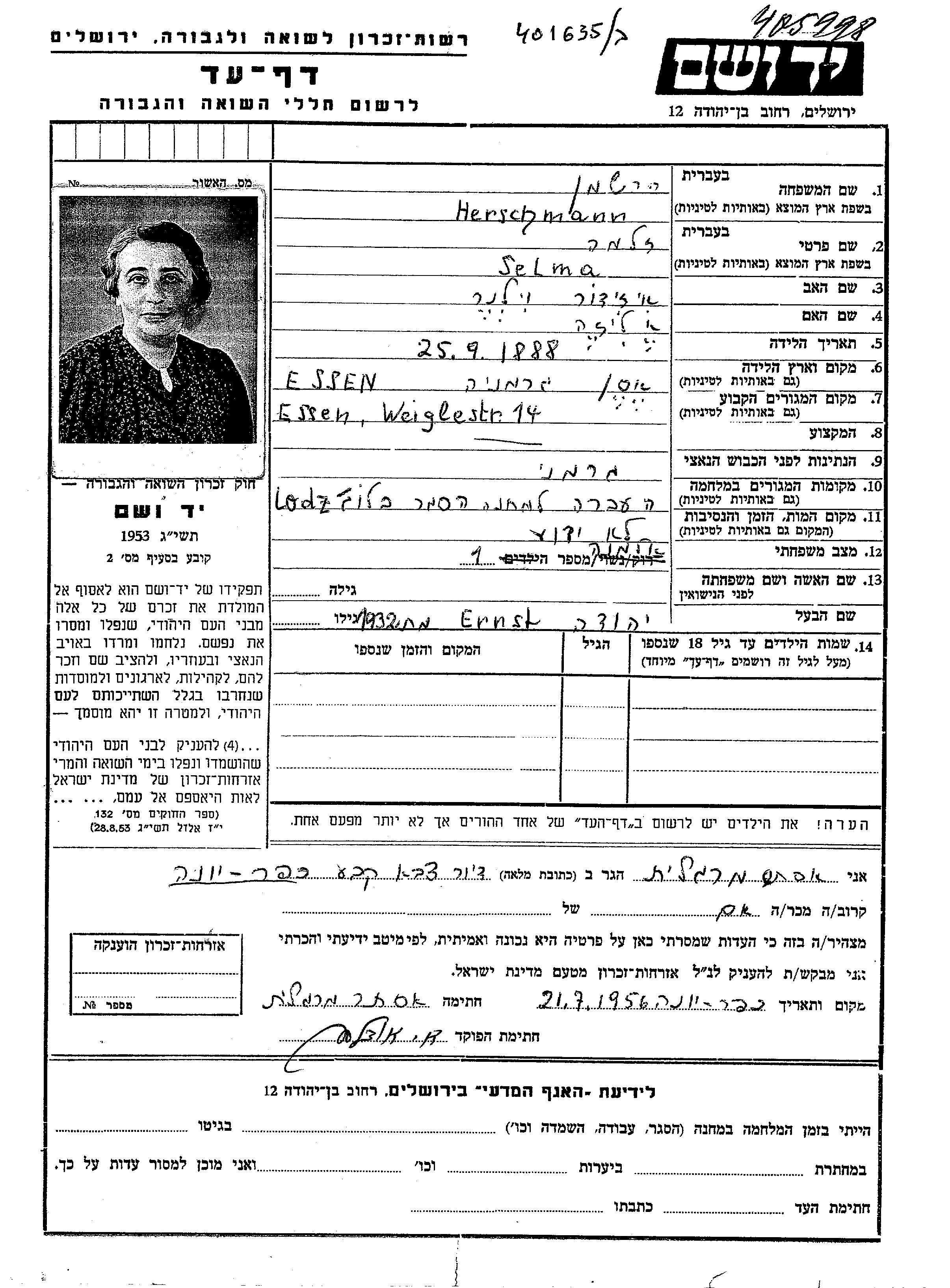 Herschmann Selma 1888 Essen, Deutsches Reich Gedenkblatt