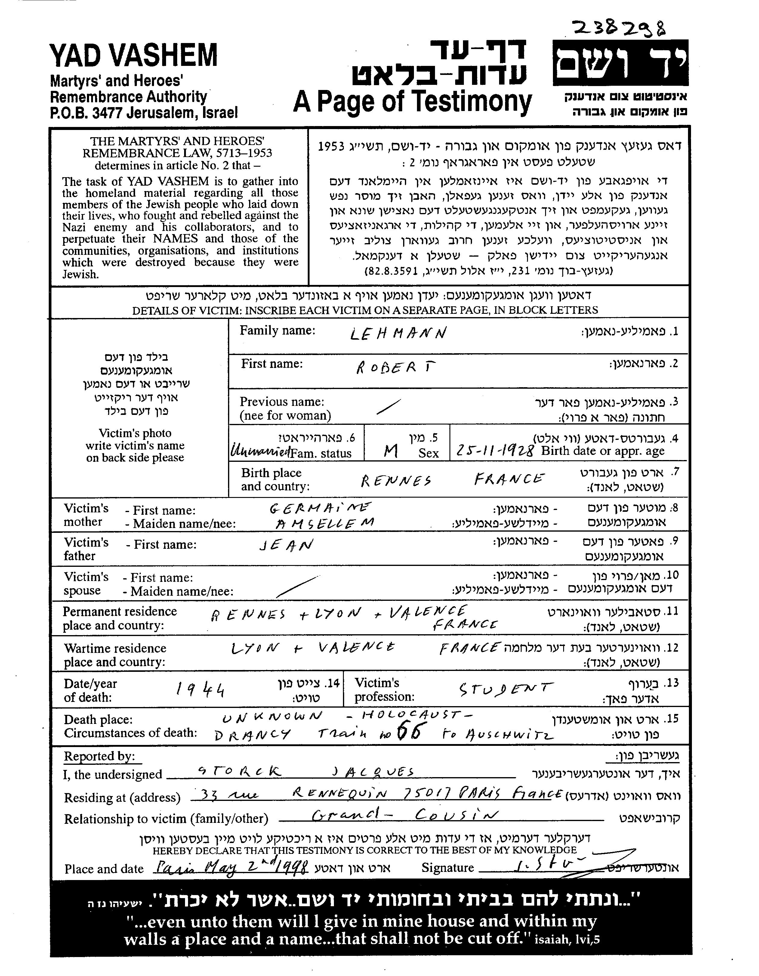 Lehmann | Robert | 1928 | Rennes, Frankreich | Liste von Deportierten aus Frankreich |