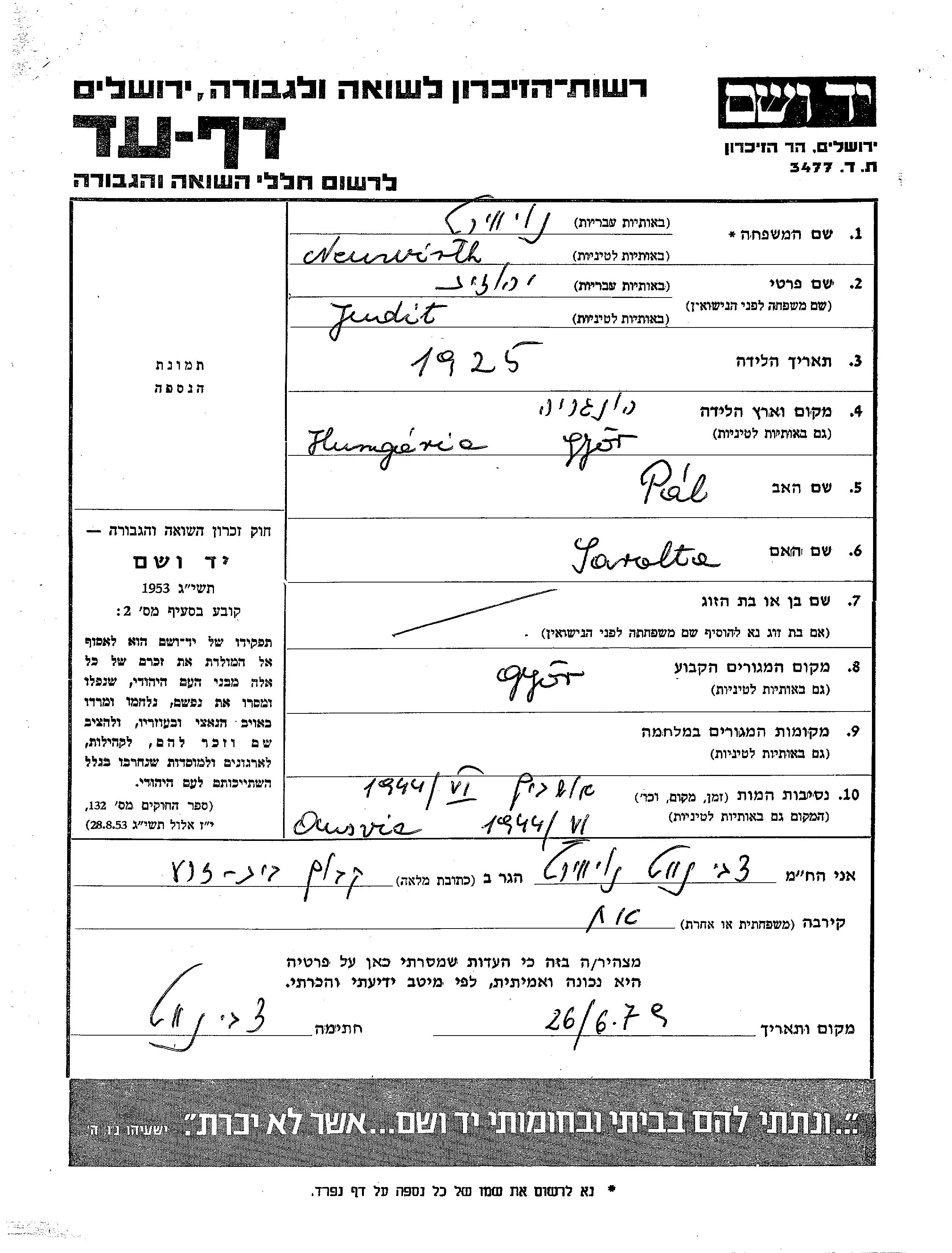 Judit Neuwirth wurde im Jahr 1925 in Gyor, Ungarn geboren. Vor dem Zweiten Weltkrieg lebte sie in Gyor, Ungarn.