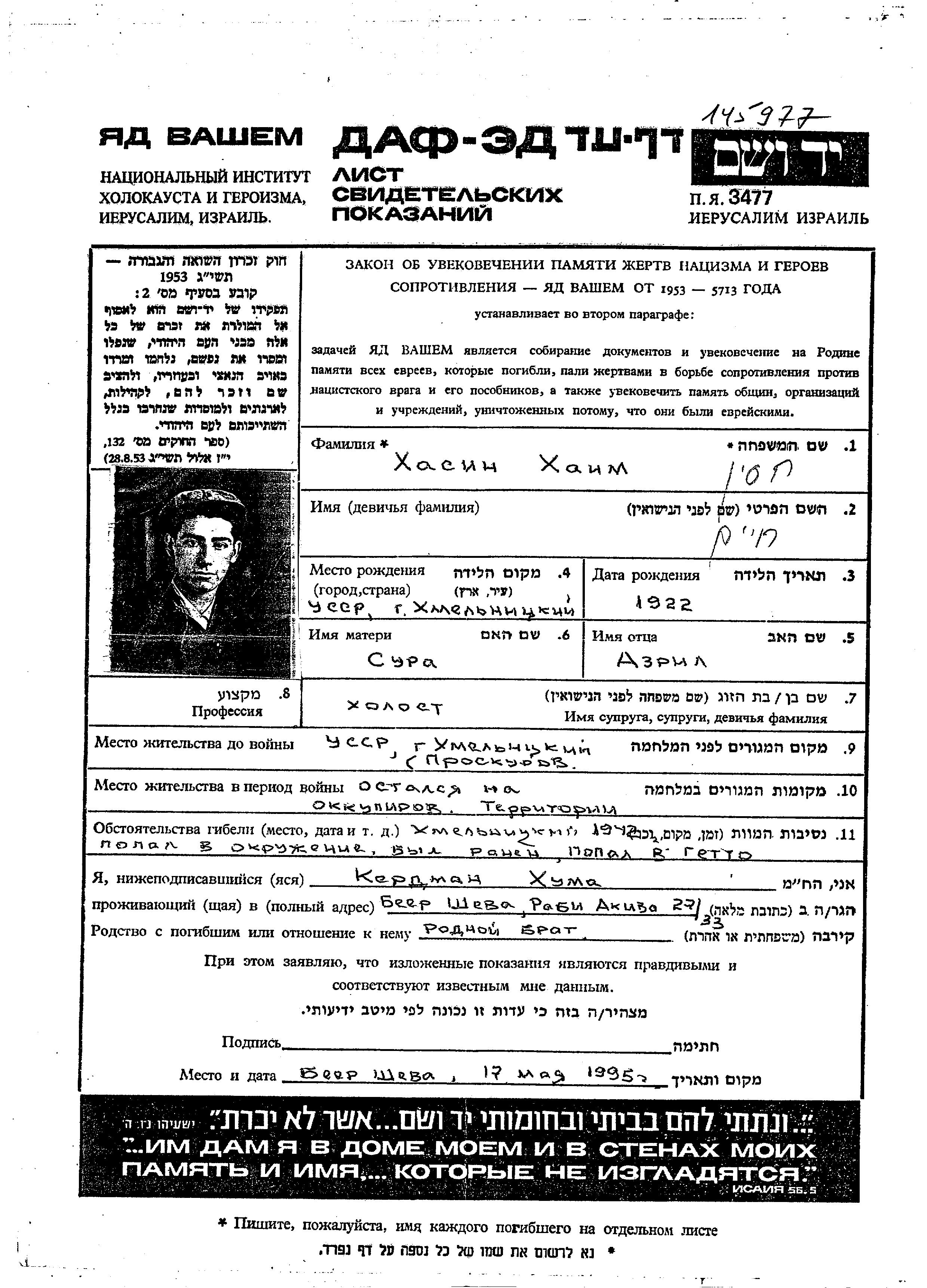 Khaim wurde in der Schoah ermordet. Todesort: Proskurov, Ukraine (UdSSR) im Jahr 1942.
