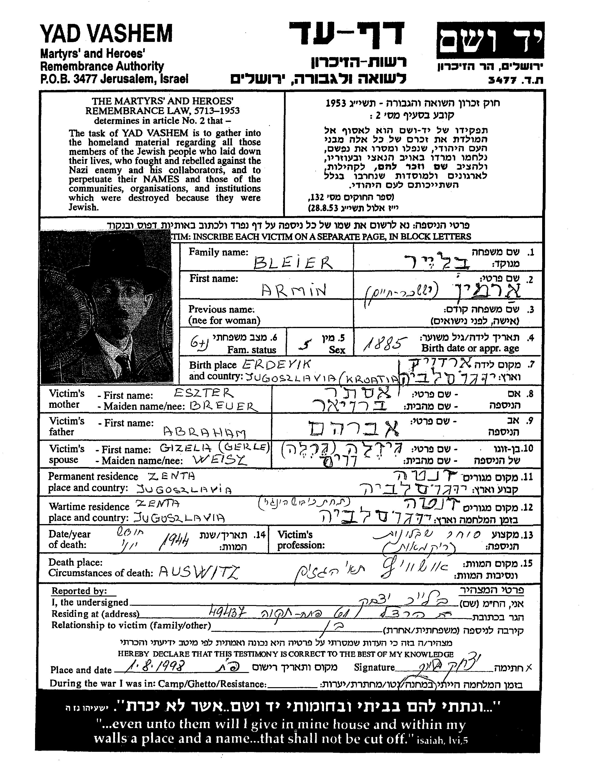 Bleier | Armin Issakhar Khaim | 1885 | Zenta, Jugoslawien | Gedenkblatt |