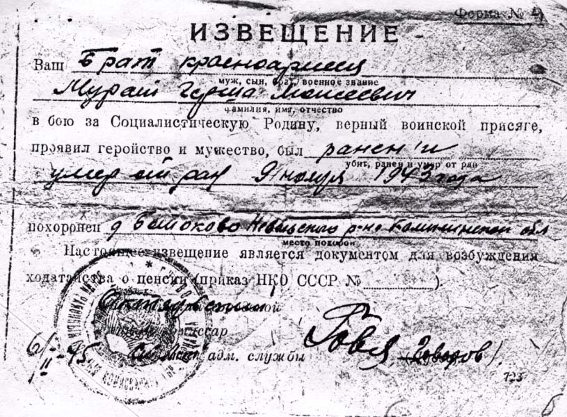 Gersh im Militärdienst umgekommen. Todesort: Kalinin, Russland (UdSSR) im Jahr 09/11/1943.