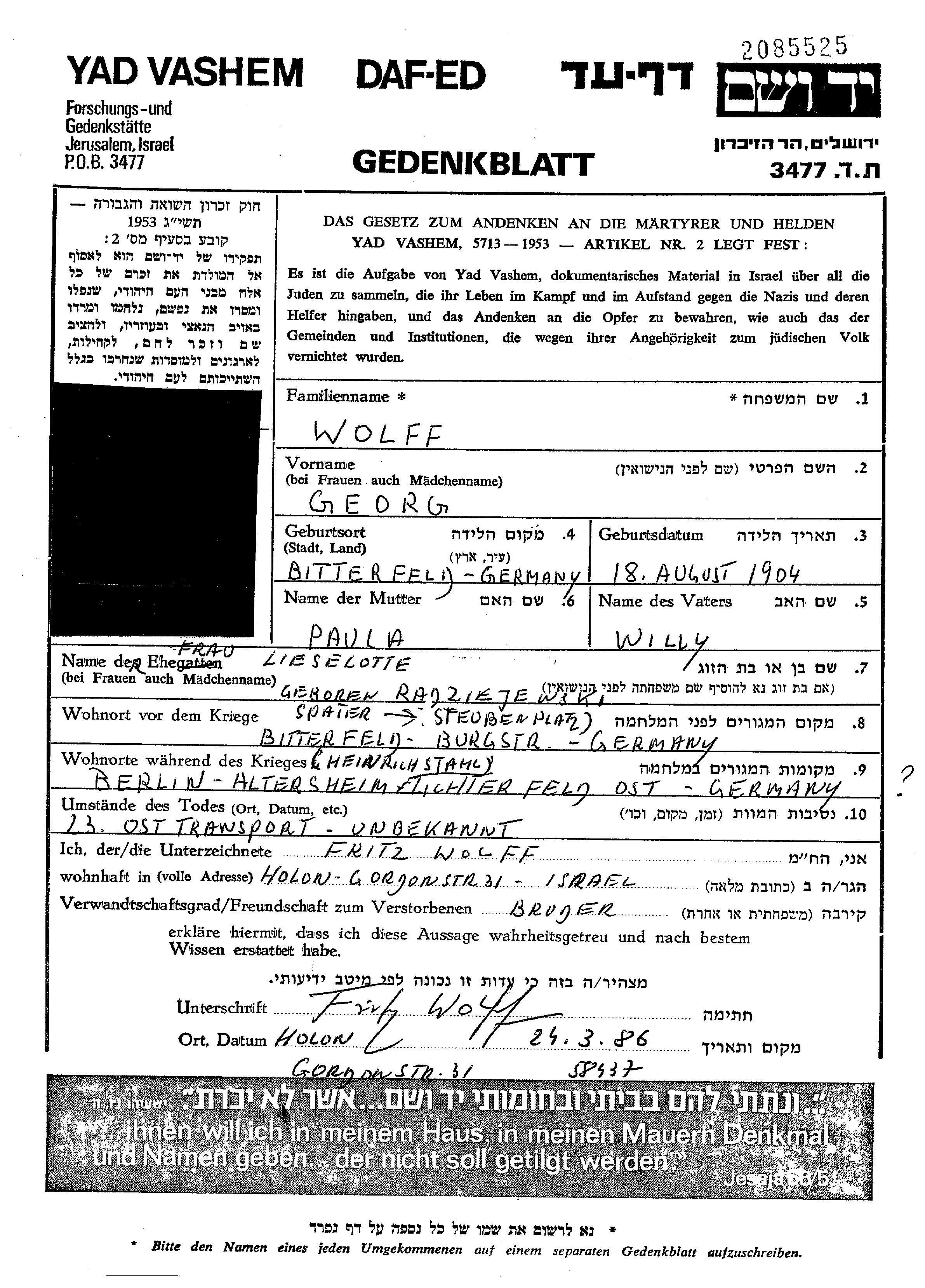 Georg Wolff wurde im Jahr 1904 in Bitterfeld, Deutsches Reich geboren. Vor dem Zweiten Weltkrieg lebte er in Bitterfeld, Deutsches Reich.