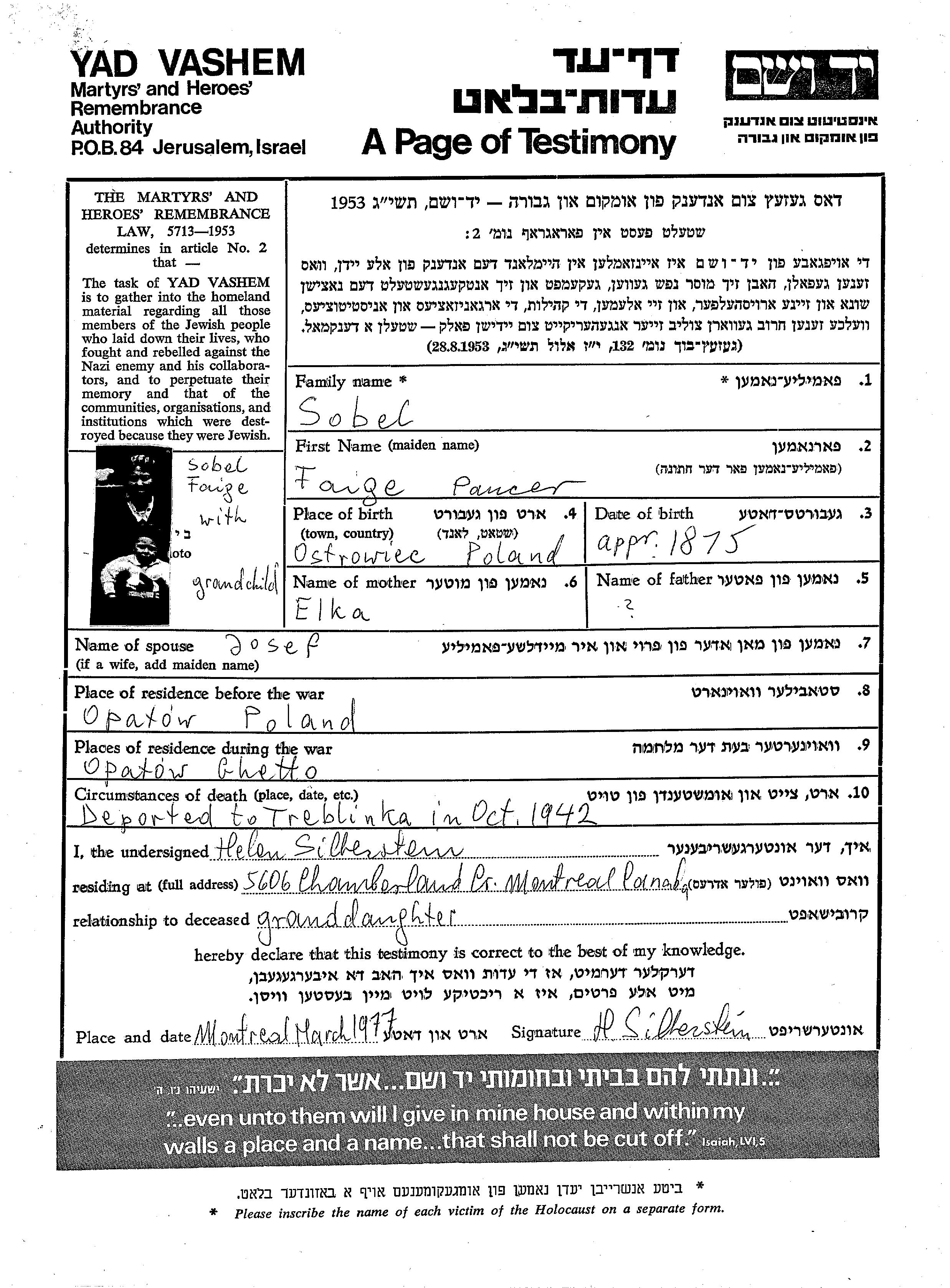 Faige Sobel, geb. Pancer wurde im Jahr 1875 in Ostrowiec, Polen geboren. Vor dem Zweiten Weltkrieg lebte sie in Opatow, Polen.