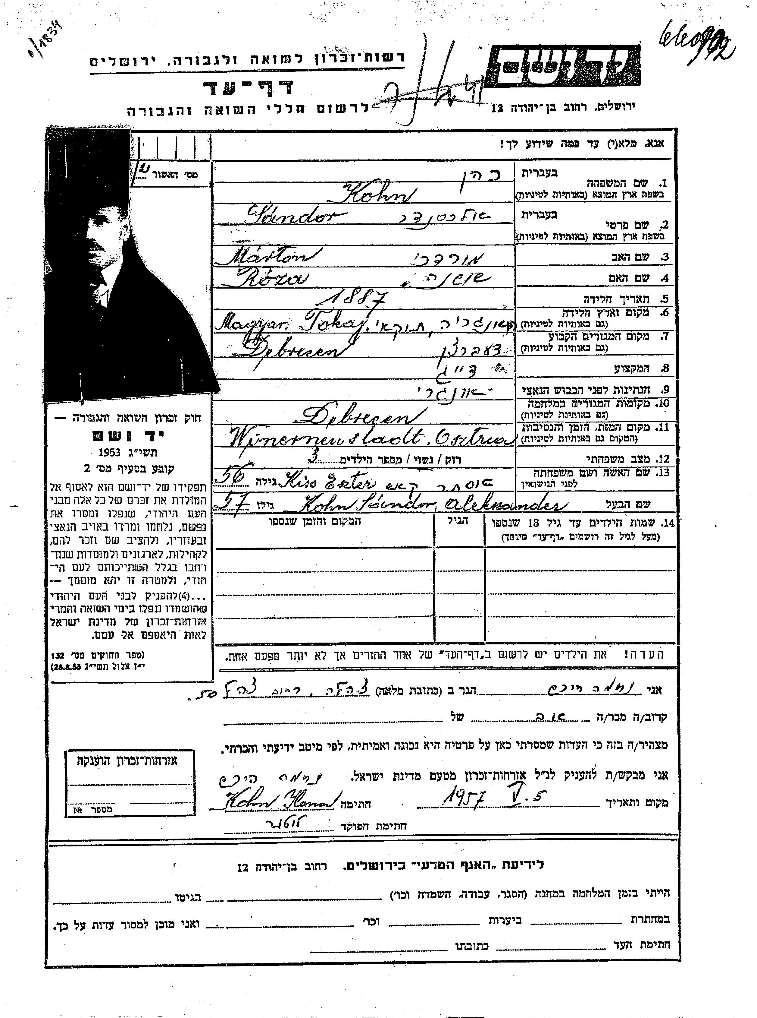 Sandor Kohn wurde im Jahr 1887 in Tokaj, Ungarn geboren. Er war Fischer. Vor dem Zweiten Weltkrieg lebte er in Debrecen, Ungarn.