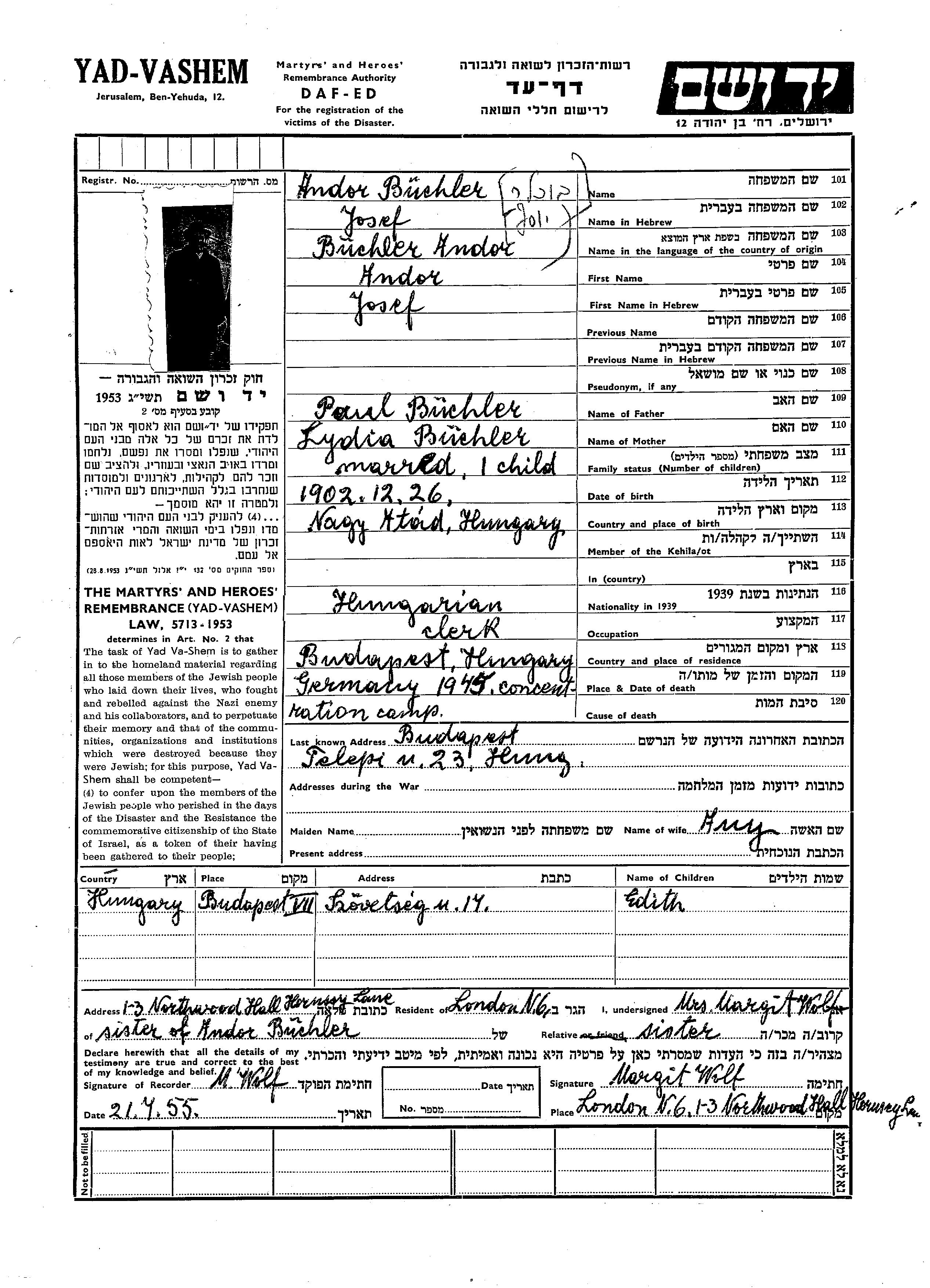 Josef Andor Buchler wurde im Jahr 1902 geboren. Er war Angestellte/-r. Vor dem Zweiten Weltkrieg lebte er in Budapest, Ungarn.
