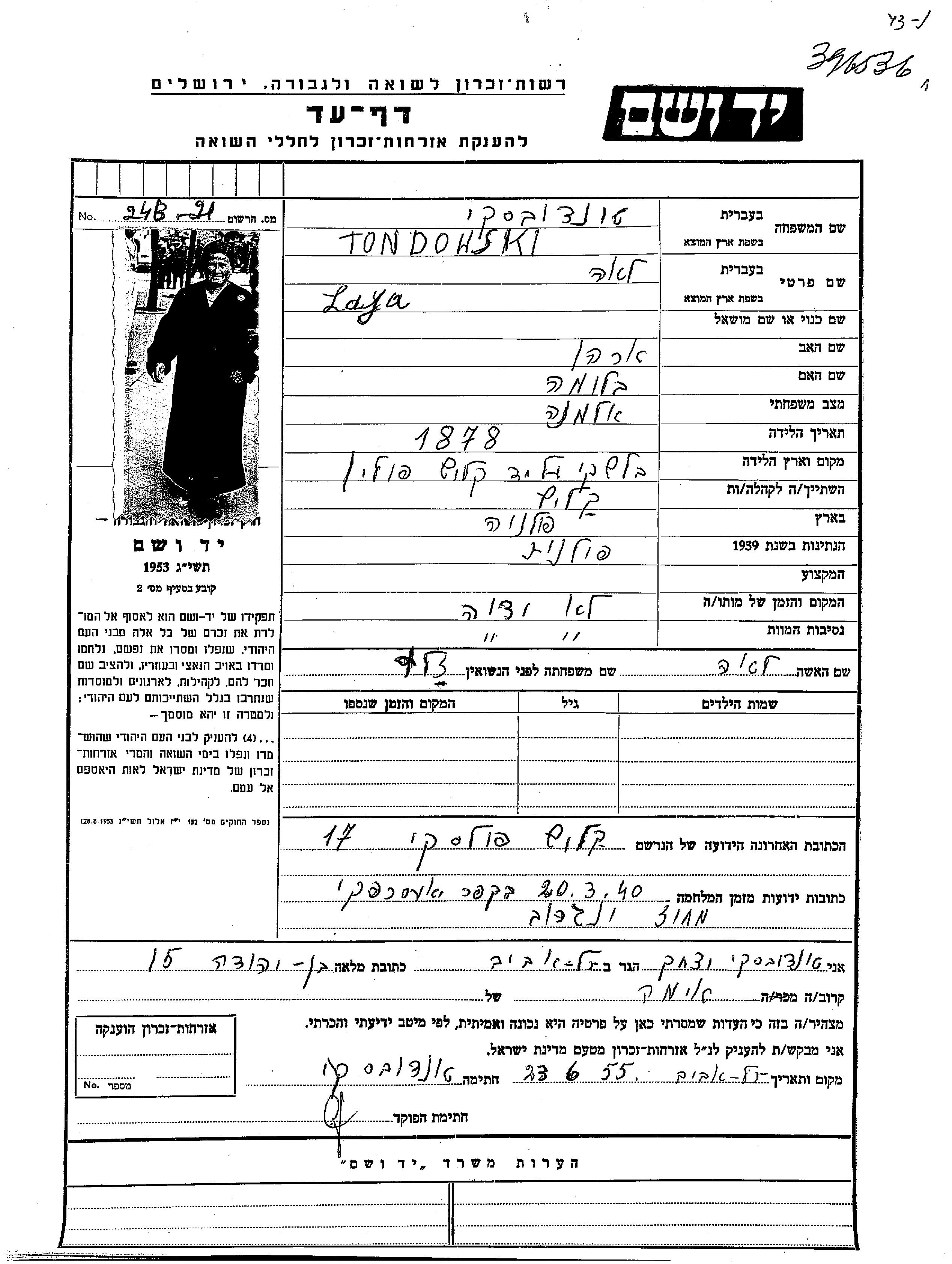 Laja Tondowski, geb. Zaltz wurde im Jahr 1878 in Blaszki, Polen geboren. Vor dem Zweiten Weltkrieg lebte sie in Kalisz, Polen.